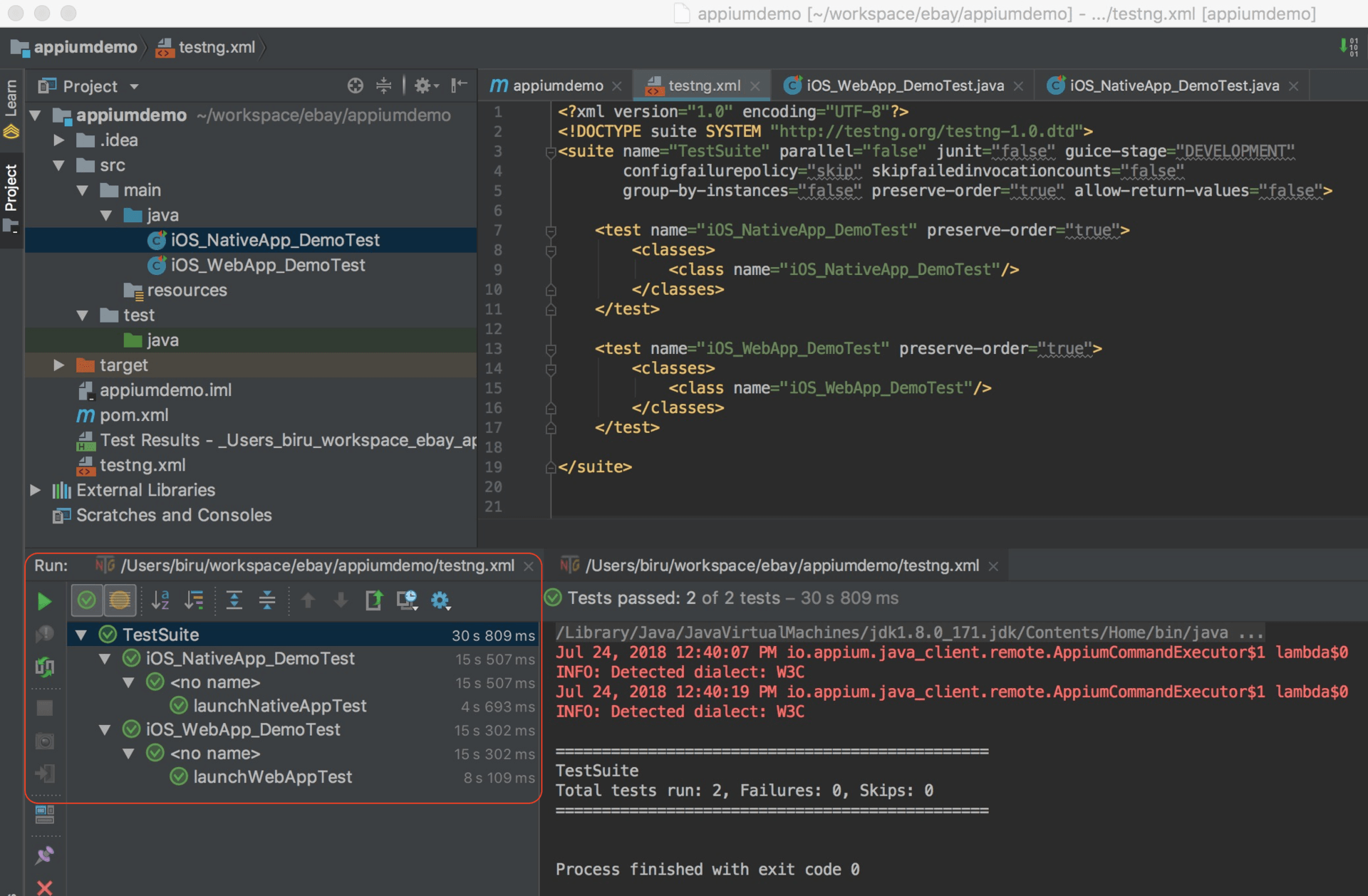 第四步,在保证Appium Server已经启动的情况下,就可以运行testng.xml执行测试了。 测试开始后,首先会自动启动基于iOS 10.0的iPhone 7模拟器,然后依次自动完成WebDriverAgent(WDA)和被测Native App的安装。