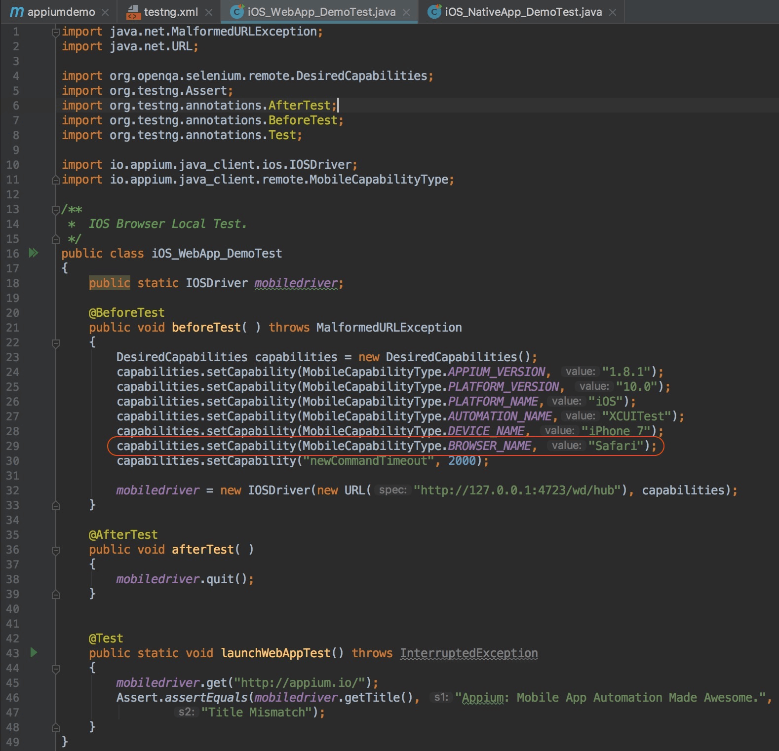 对于测试用例的主体部分,也就是代码的第45-47行就比较简单了,首先打开Safari浏览器并访问“http://appium.io/”,接着用断言方法assertEquals验证页面的Title是不是“Appium: Mobile App Automation Made Awesome.”。其中,实际页面的Title,可以通过mobiledriver的getTitle方法获得。