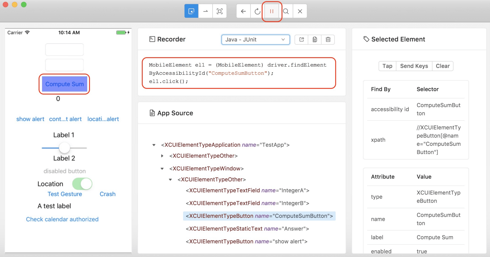 Native App的测试用例,被测App我选用了Appium官方的示例App,被测App的源代码可以通过“https://github.com/appium/ios-test-app” 下载,然后在Xcode中编译打包成TestApp.app。- 具体的测试需求是输入两个数字,然后点击“Compute Sum”验证两个数字相加后的结果是否正确。
