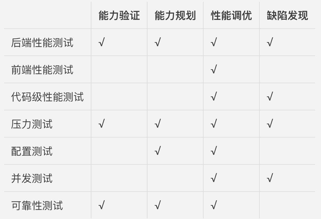 然后,我跟你分享了后端性能测试、前端性能测试、代码级性能测试、压力测试、配置测试、并发测试,以及可靠性测试这七种常用的性能测试方法,并探讨了这七种方法在能力验证、能力规划、性能调优和缺陷发现这四种场景下的使用情况。