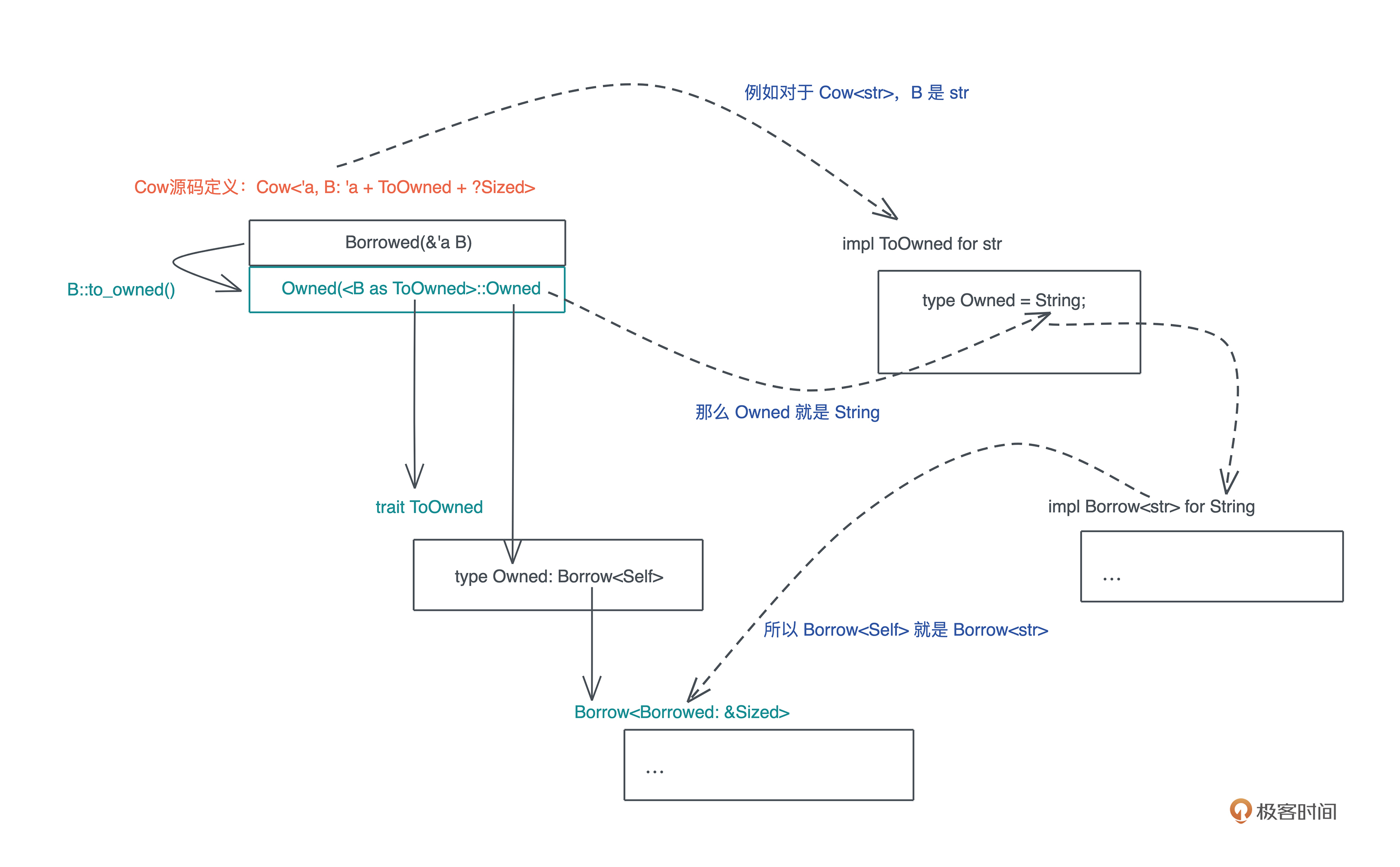 Cow 实现了 Clone-on-write 的数据结构,让你可以在需要的时候再获得数据的所有权。Cow 结构是一种使用 enum 根据当前的状态进行分发的经典方案。甚至,你可以用类似的方案取代 trait object 做动态分发,其效率是动态分发的数十倍。