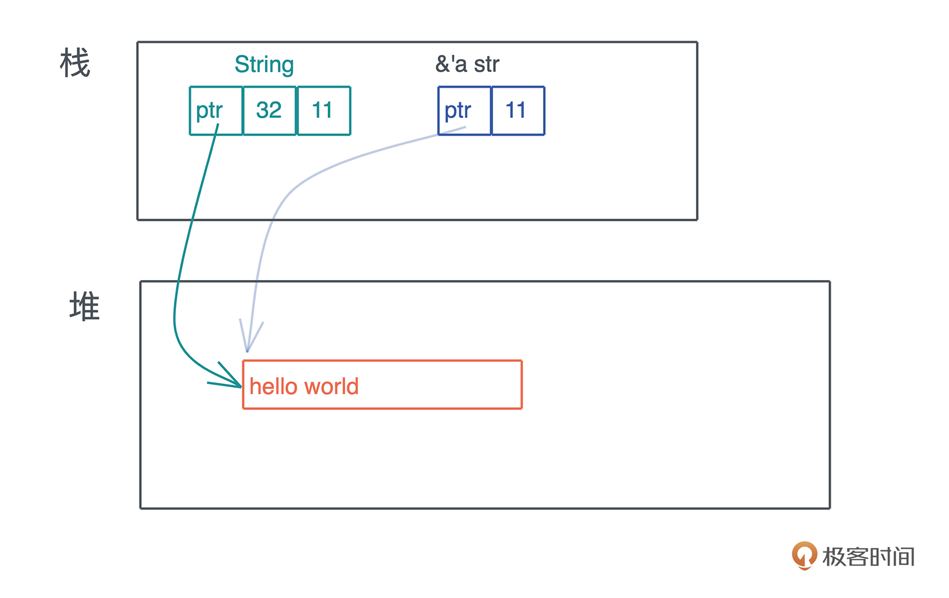 你有没有觉得很像之前讲的胖指针。智能指针一定是一个胖指针,但胖指针不一定是一个智能指针。比如 &str 就只是一个胖指针,它有指向堆内存字符串的指针,同时还有关于字符串长度的元数据。