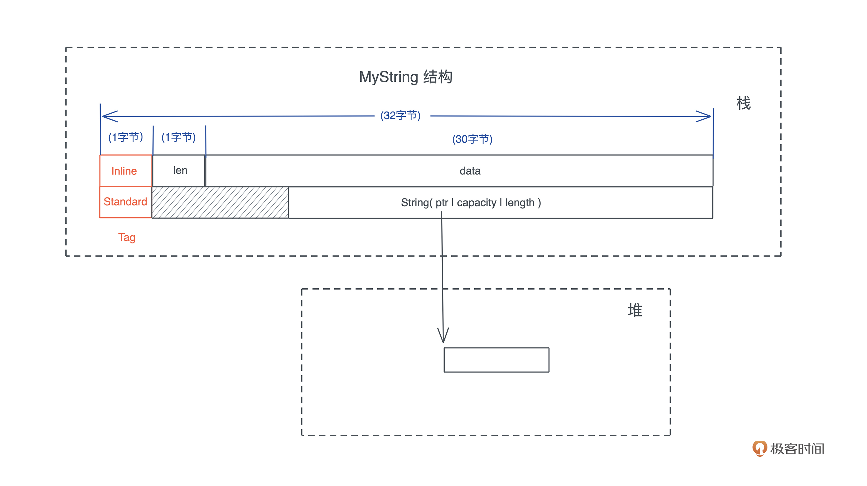 所以,可以设计一个数据结构,内部用一个字节表示字符串的长度,用 30 个字节表示字符串内容,再加上 1 个字节的 tag,正好也是 32 字节,可以和 String 放在一个 enum 里使用。我们暂且称这个 enum 叫 MyString,它的结构如下图所示: