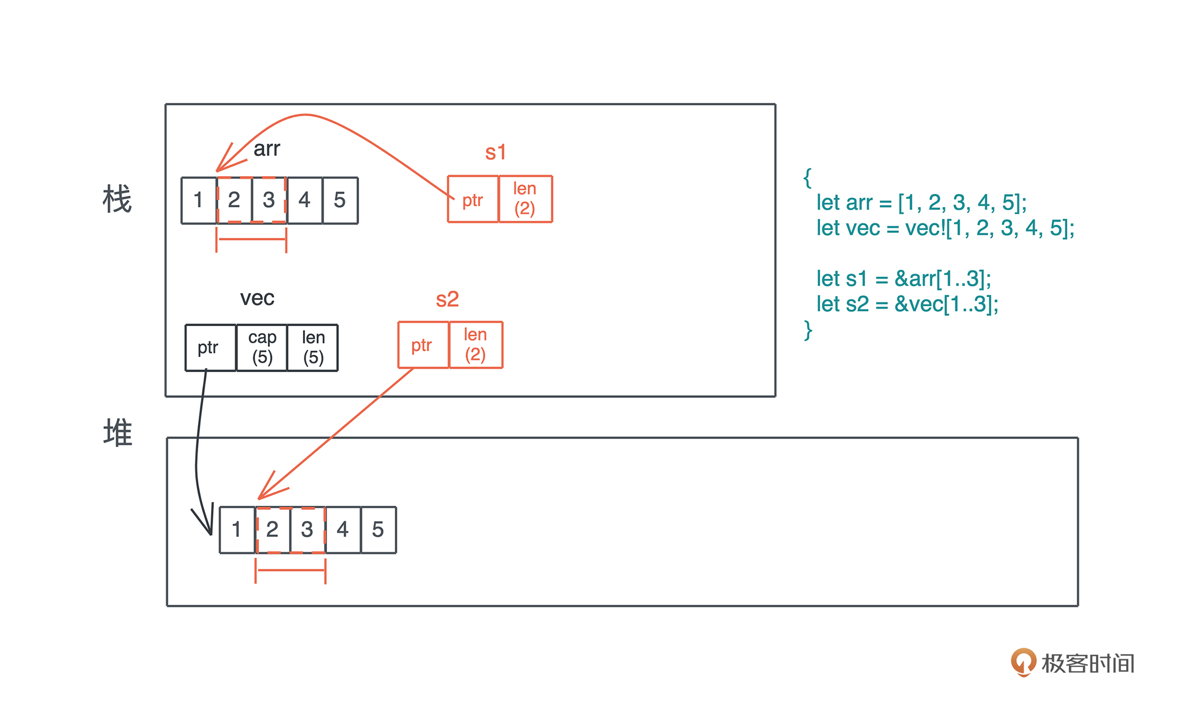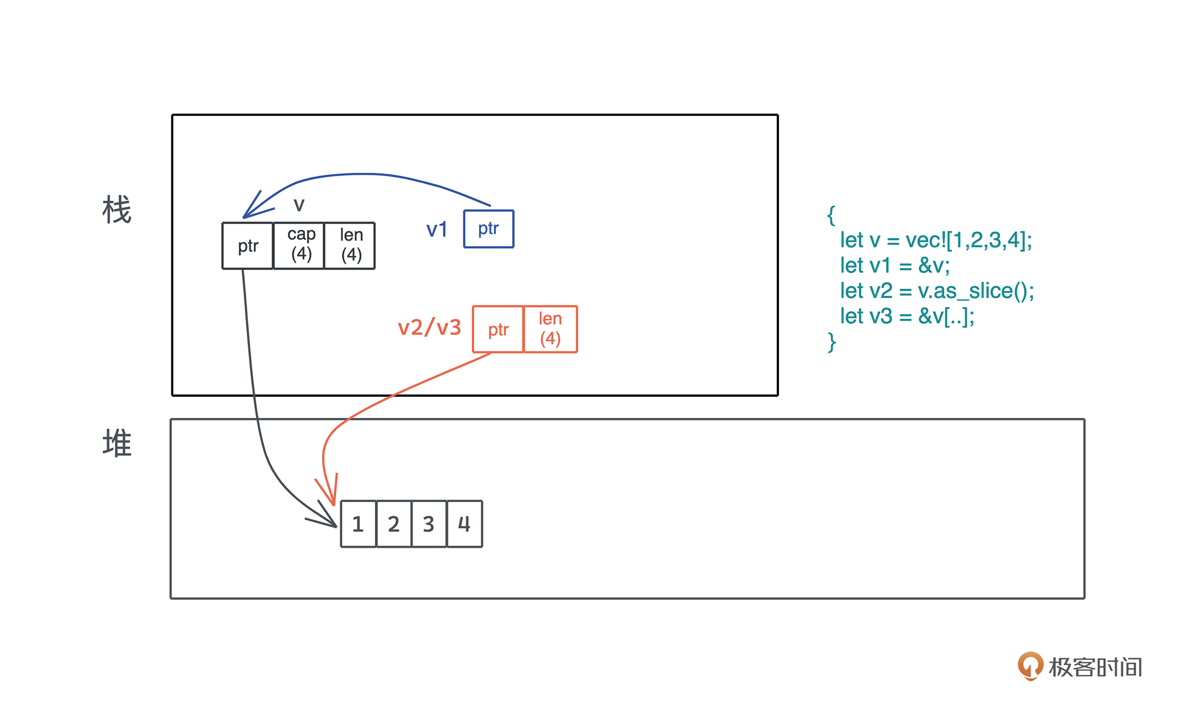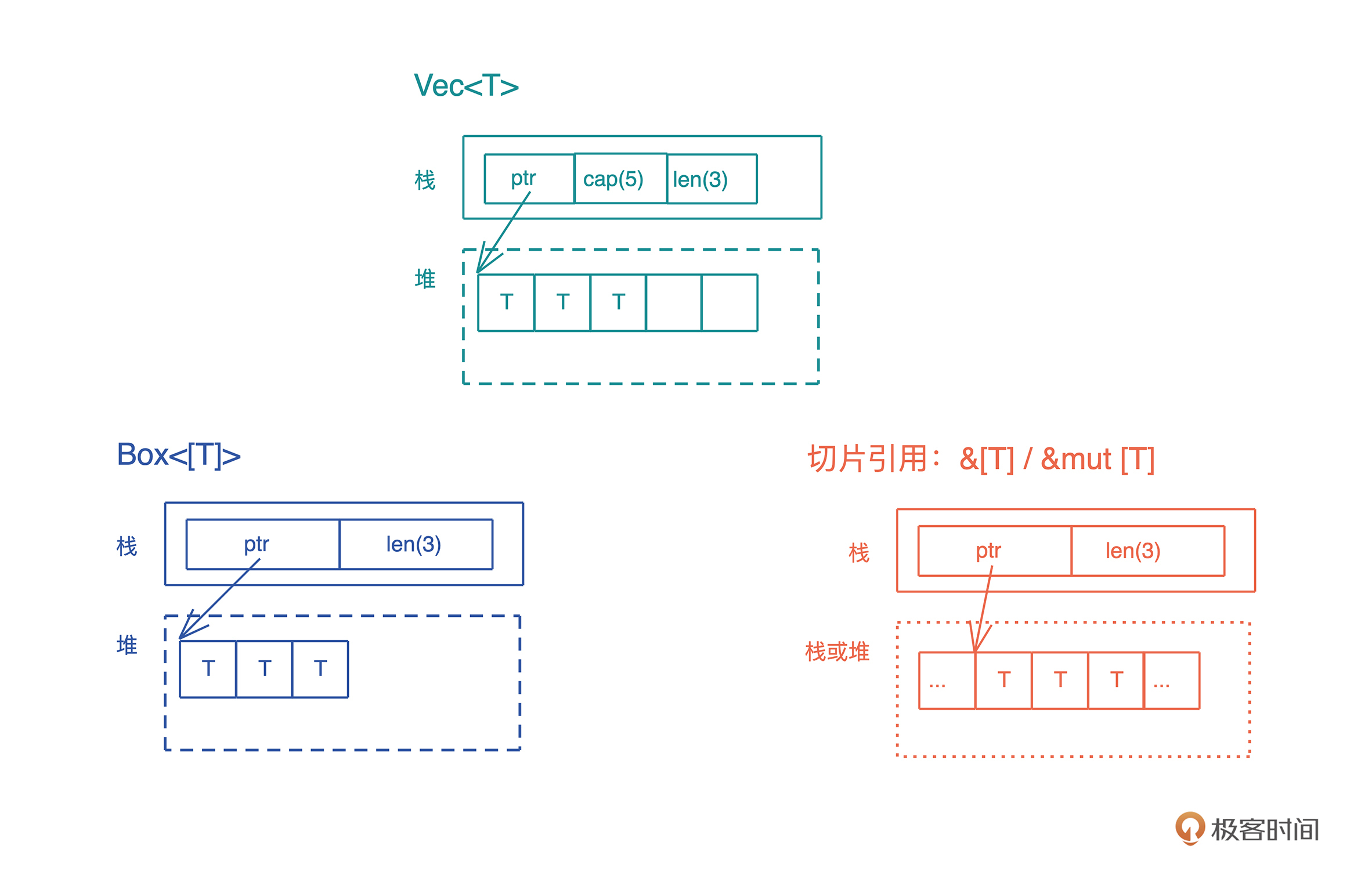 另外在 Rust 下,切片日常中都是使用引用 &[T],所以很多同学容易搞不清楚 &[T] 和 &Vec