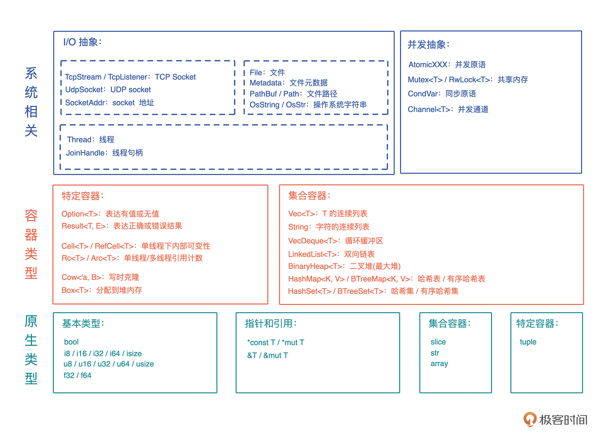 现在我们接触到了越来越多的数据结构,我把 Rust 中主要的数据结构从原生类型、容器类型和系统相关类型几个维度整理一下,你可以数数自己掌握了哪些。-