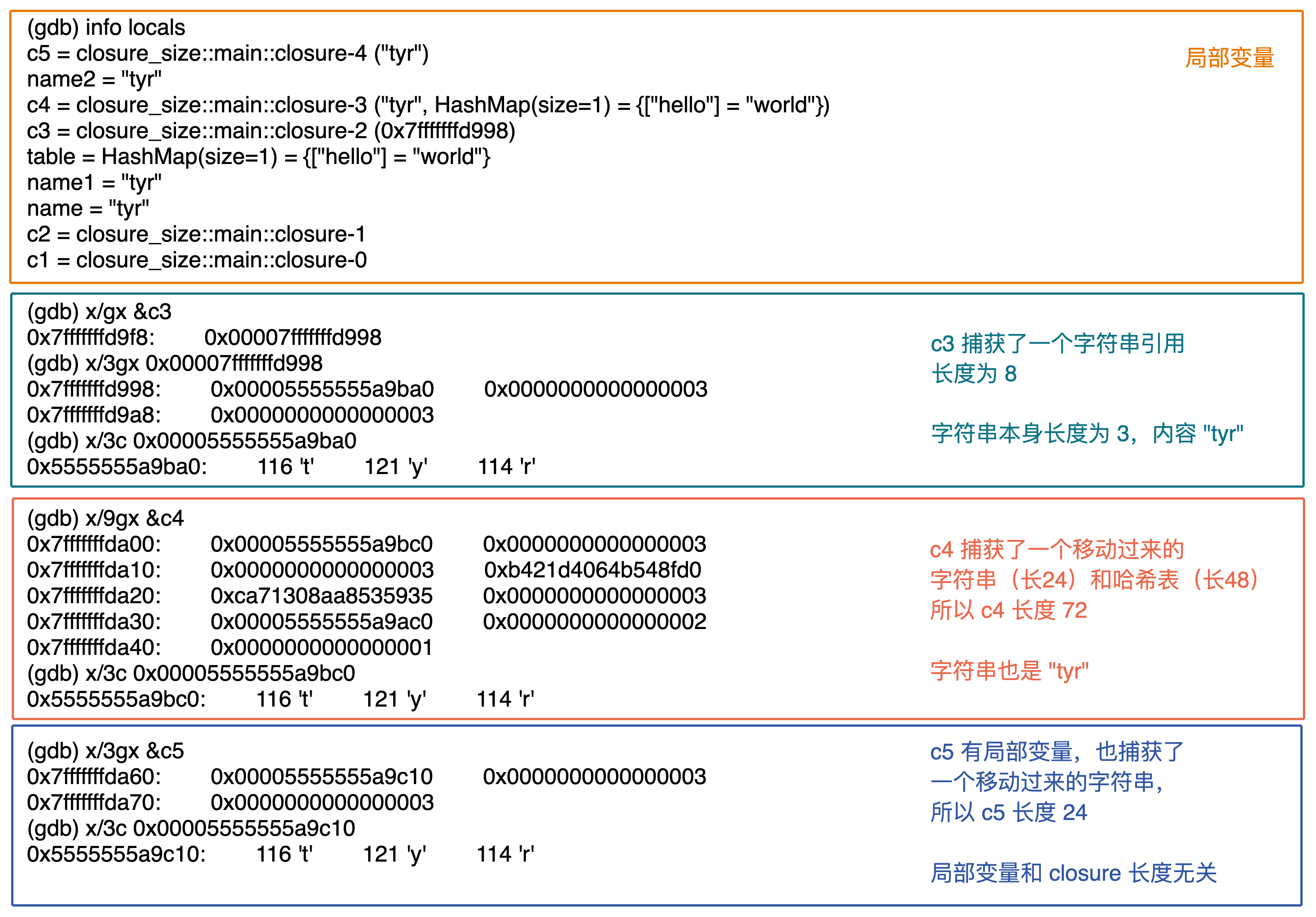 那一个闭包类型在内存中究竟是如何排布的,和结构体有什么区别?我们要再次结合 rust-gdb 探索,看看上面的代码在运行结束前,几个长度不为 0 闭包内存里都放了什么:-