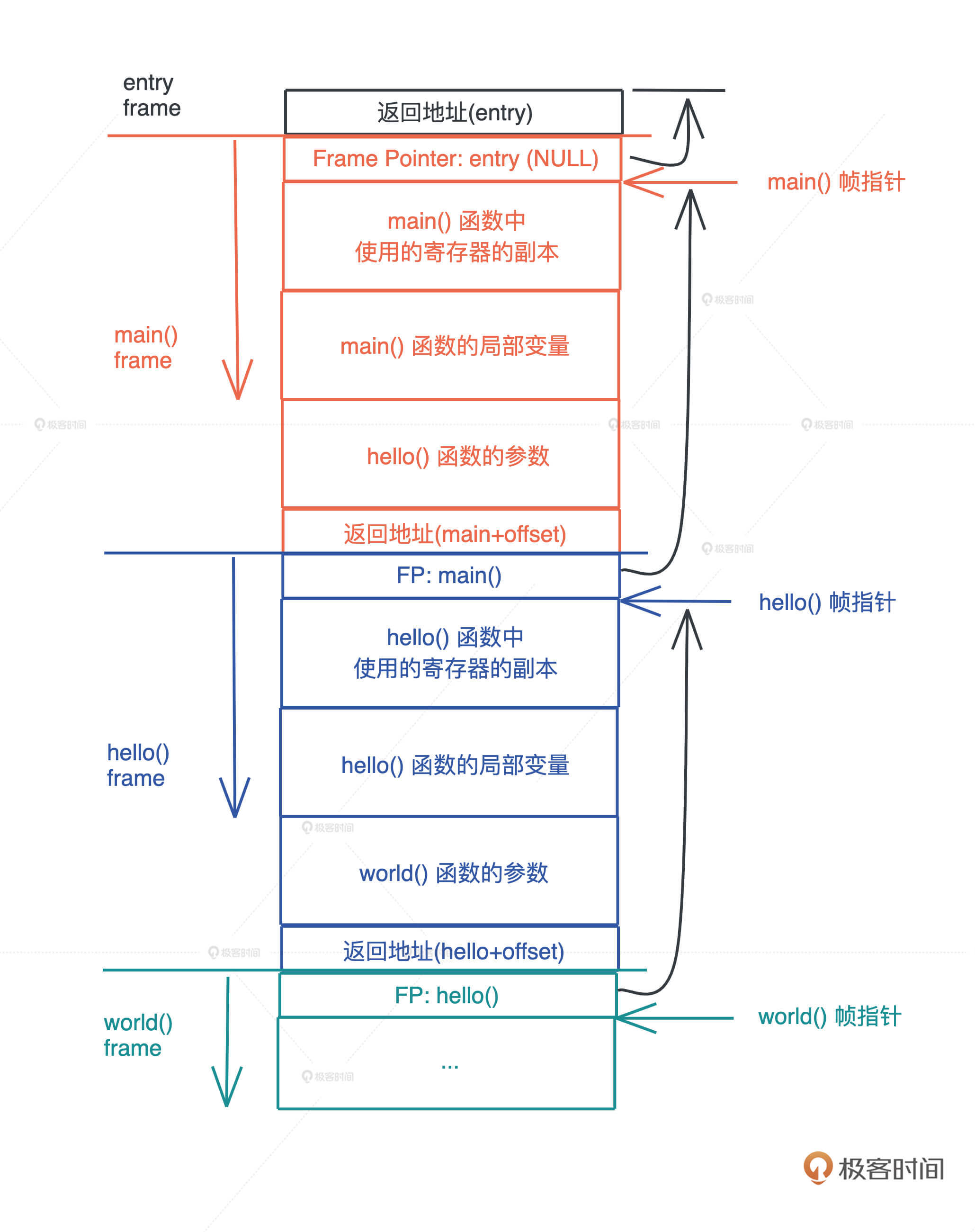 还知道了,闭包的大小跟参数、局部变量都无关,只跟捕获的变量有关。如果你回顾[第一讲]函数调用,参数和局部变量在栈中如何存放的图,就很清楚了:因为它们是在调用的时刻才在栈上产生的内存分配,说到底和闭包类型本身是无关的,所以闭包的大小跟它们自然无关。-
