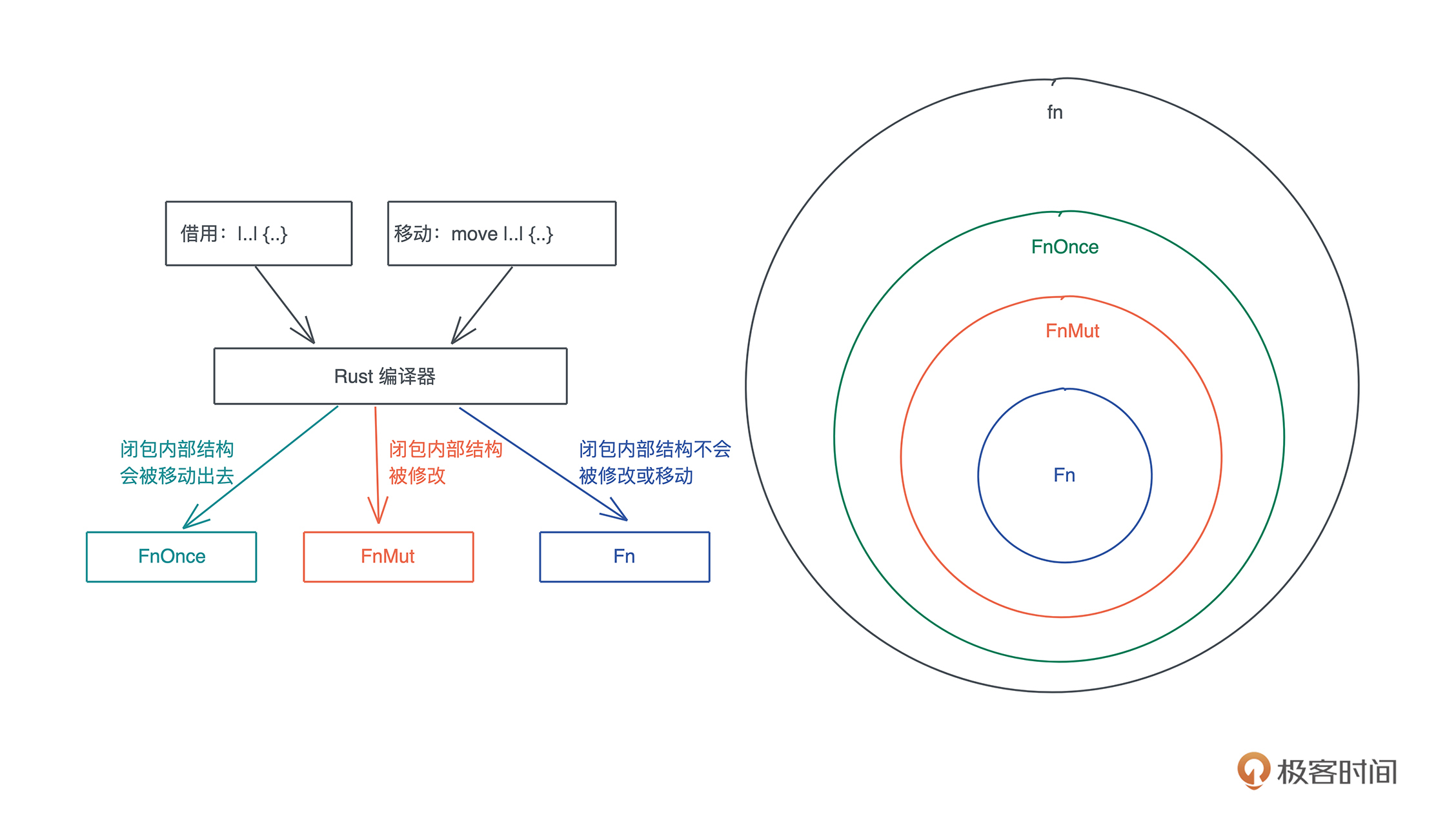 现在我们搞明白了闭包究竟是个什么东西,在内存中怎么表示,接下来我们看看 FnOnce/FnMut/Fn 这三种闭包类型有什么区别。