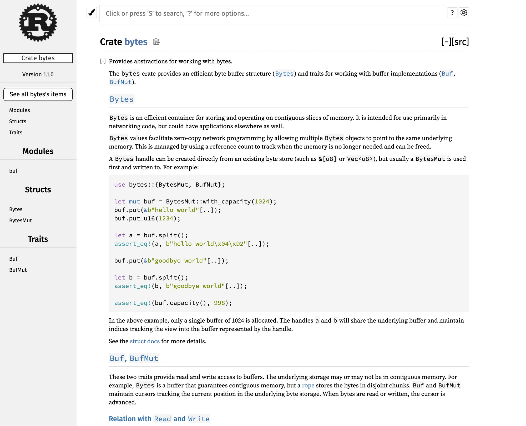 Rust 几乎所有库的文档都在 docs.rs 下,比如 Bytes 的文档可以通过 docs.rs/bytes 访问:-