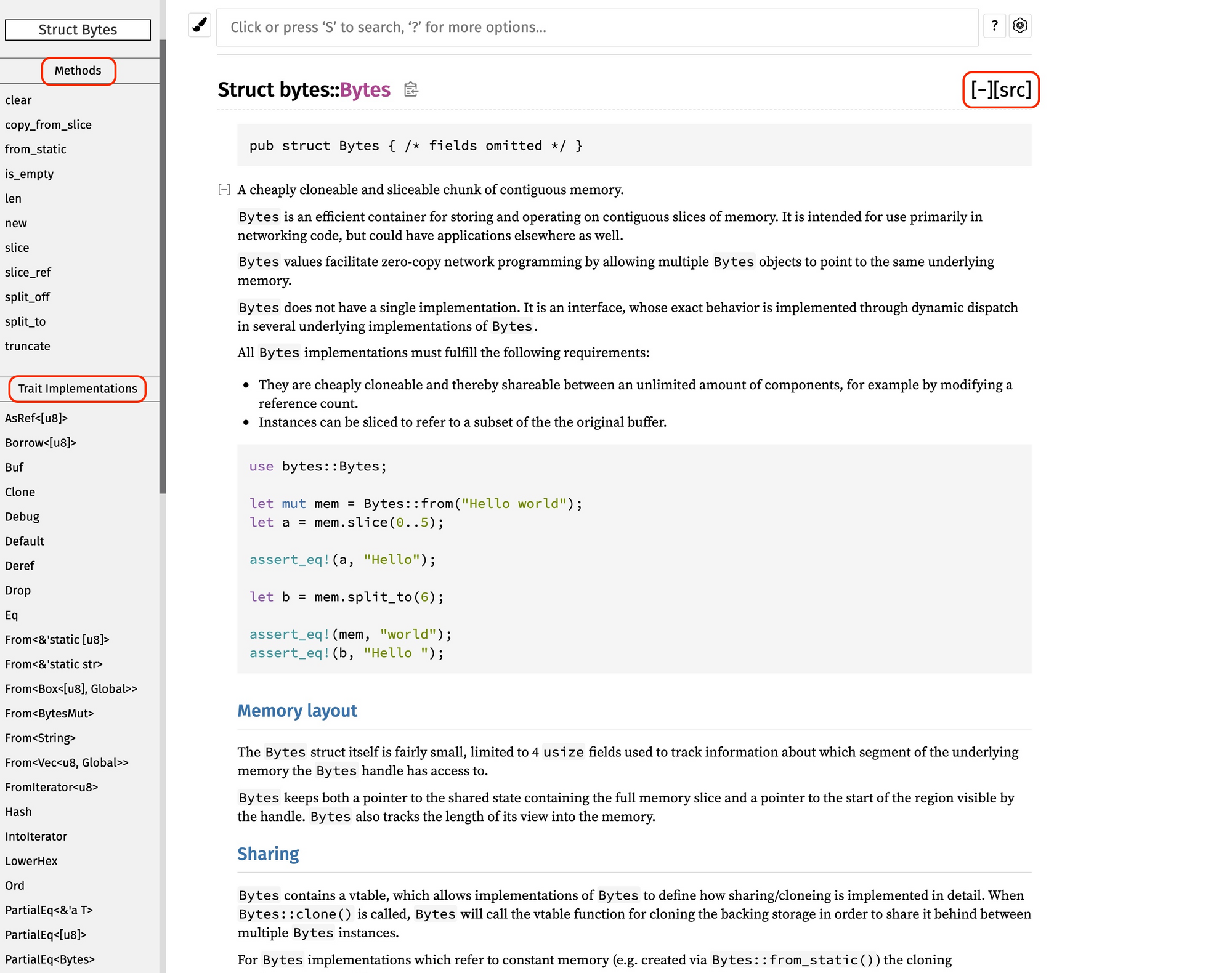 你甚至不用 clone bytes 的源码,在 docs.rs 里就可以直接完成这些代码的阅读,非常方便。
