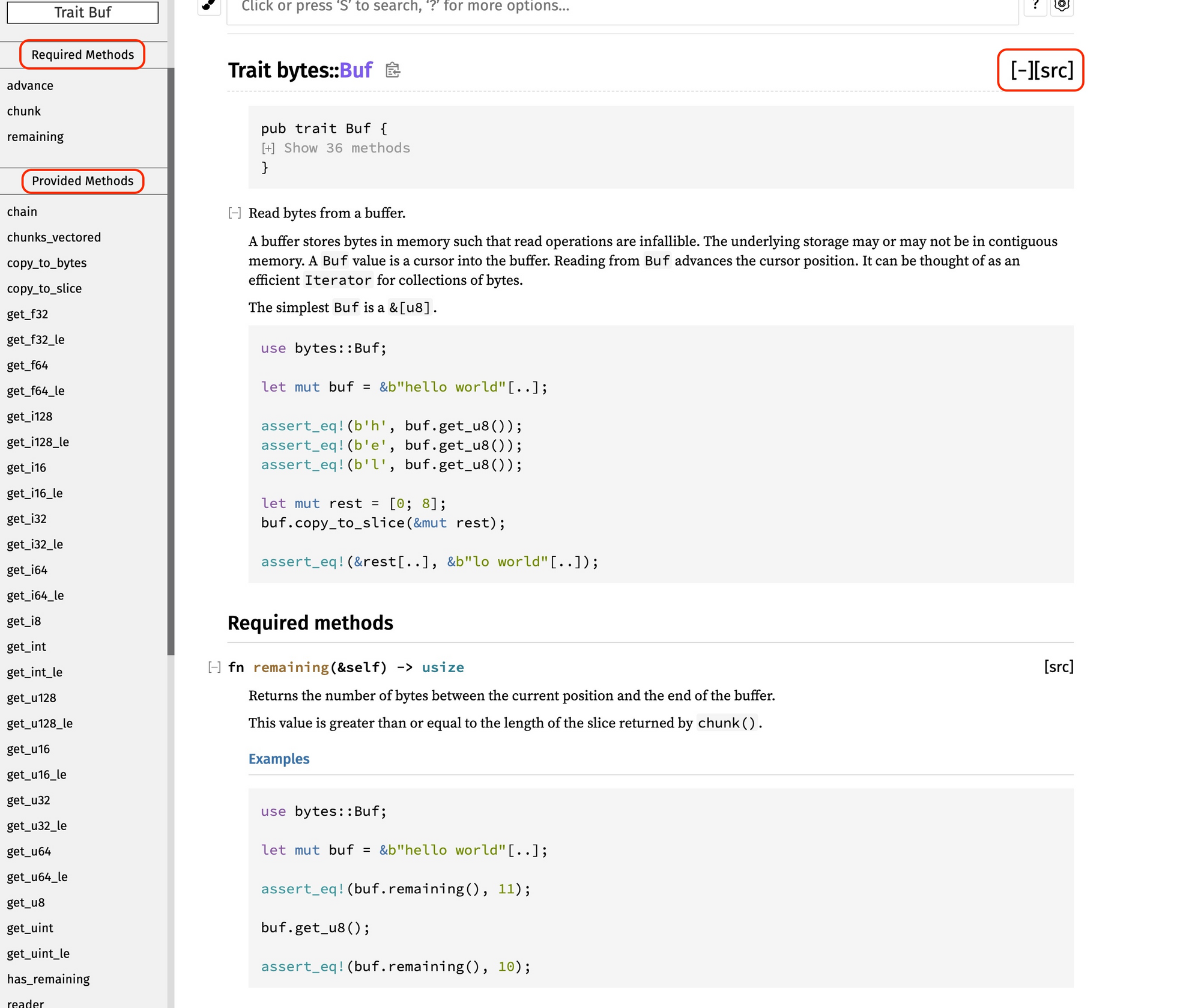 注意左侧导航栏的 “required Methods” 和 “Provided Methods”,前者是实现这个 trait 需要实现的方法,后者是缺省方法。也就是说数据结构只要实现了这个 trait 的三个方法:advance()、chunk() 和 remaining(),就可以自动实现所有的缺省方法。当然,你也可以重载某个缺省方法。