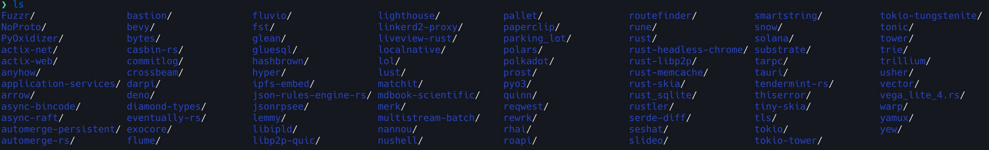 这时,光靠 docs.rs 上的代码已经满足不了我们的需求,我们要把代码 clone 下来,用 VS Code 打开仔细研究。下图展示了本地 ~/projects/opensource/rust 目录下的代码,它们都是我在不同时期,为了不同的目的,在某些场景下阅读过的源代码:-