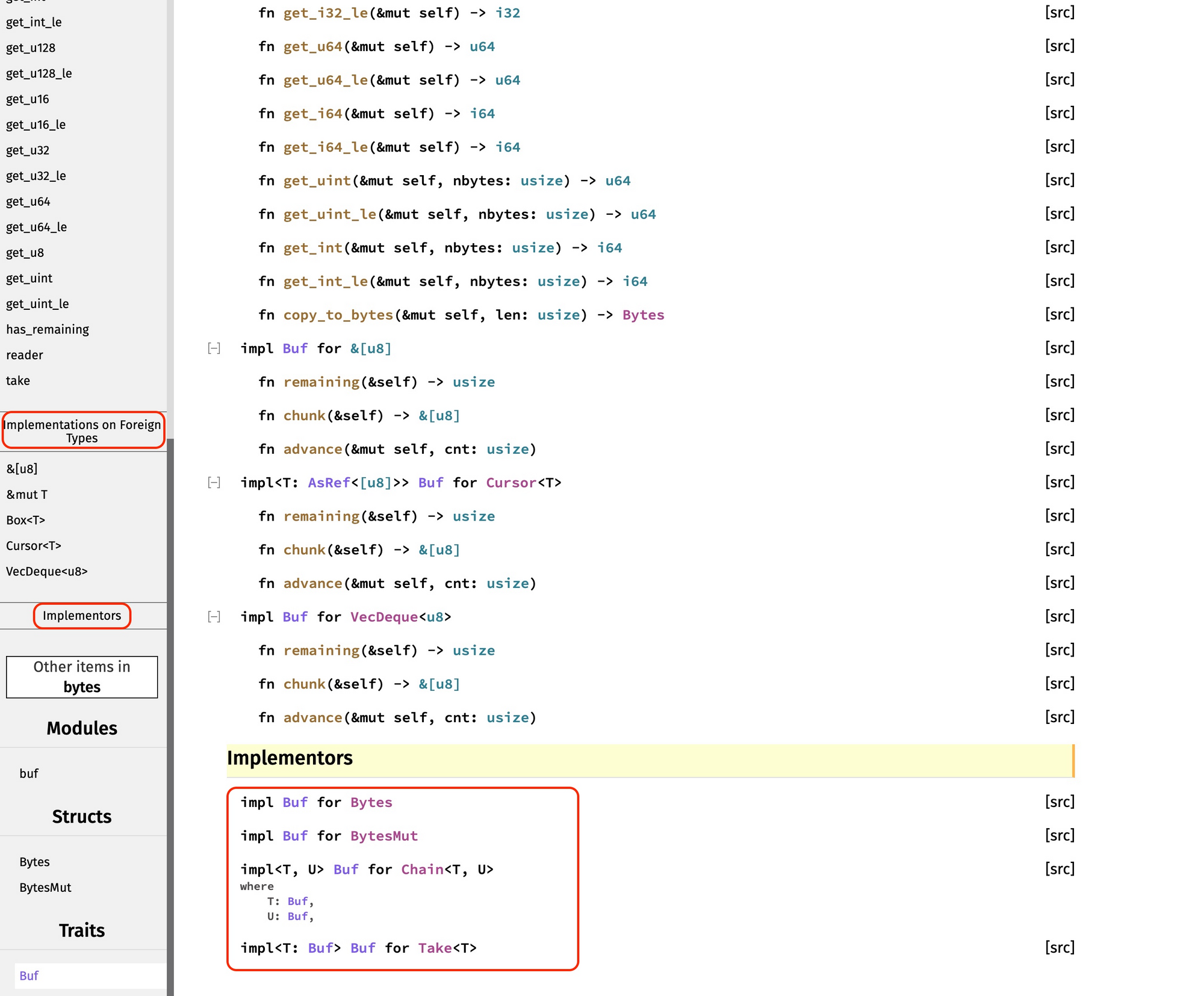 导航栏继续往下拉,可以看到 bytes 为哪些 “foreign types” 实现了 Buf trait,以及当前模块有哪些 implementors。这些信息很重要,说明了这个 trait 的生态:-