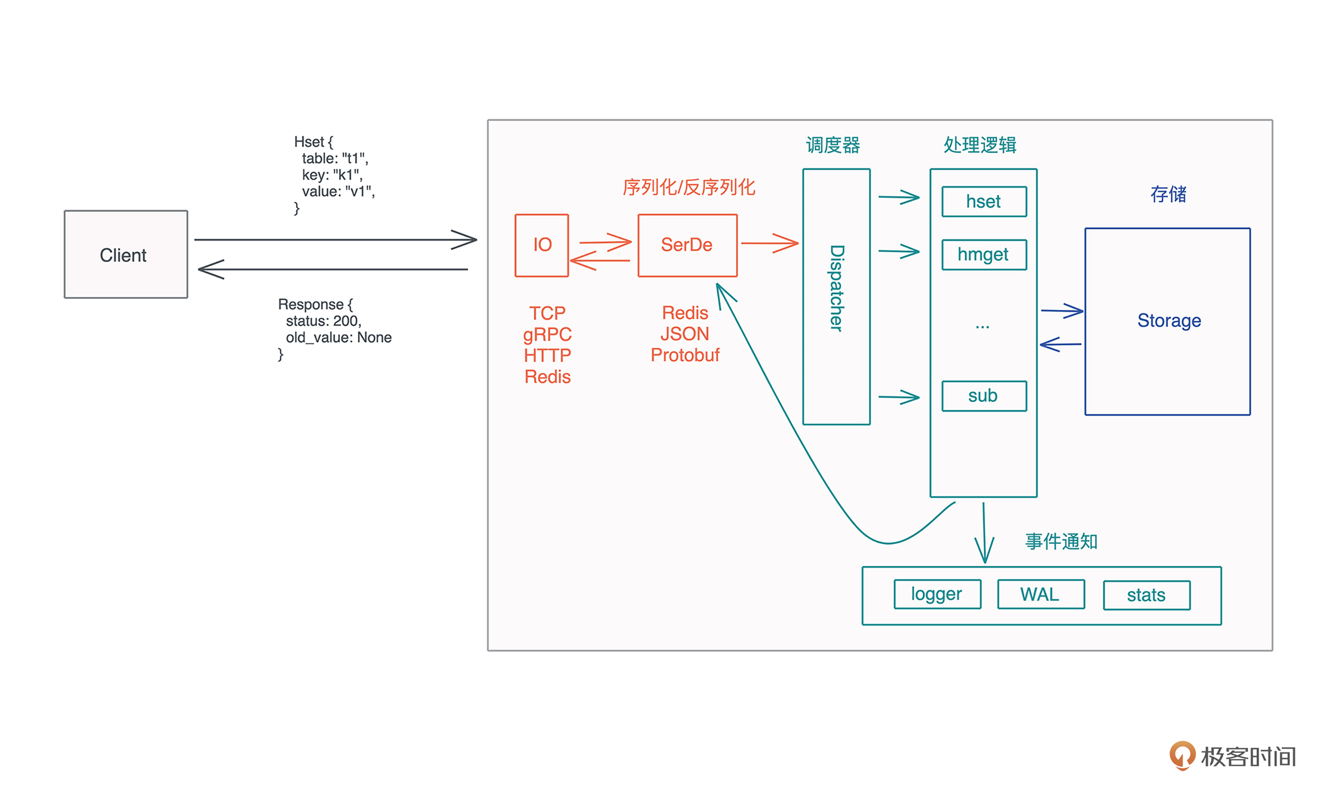 4.处理流程中计划加这些 hook:收到客户端的命令后 OnRequestReceived、处理完客户端的命令后 OnRequestExecuted、发送响应之前 BeforeResponseSend、发送响应之后 AfterResponseSend。这样,处理过程中的主要步骤都有事件暴露出去,让我们的 KV server 可以非常灵活,方便调用者在初始化服务的时候注入额外的处理逻辑。