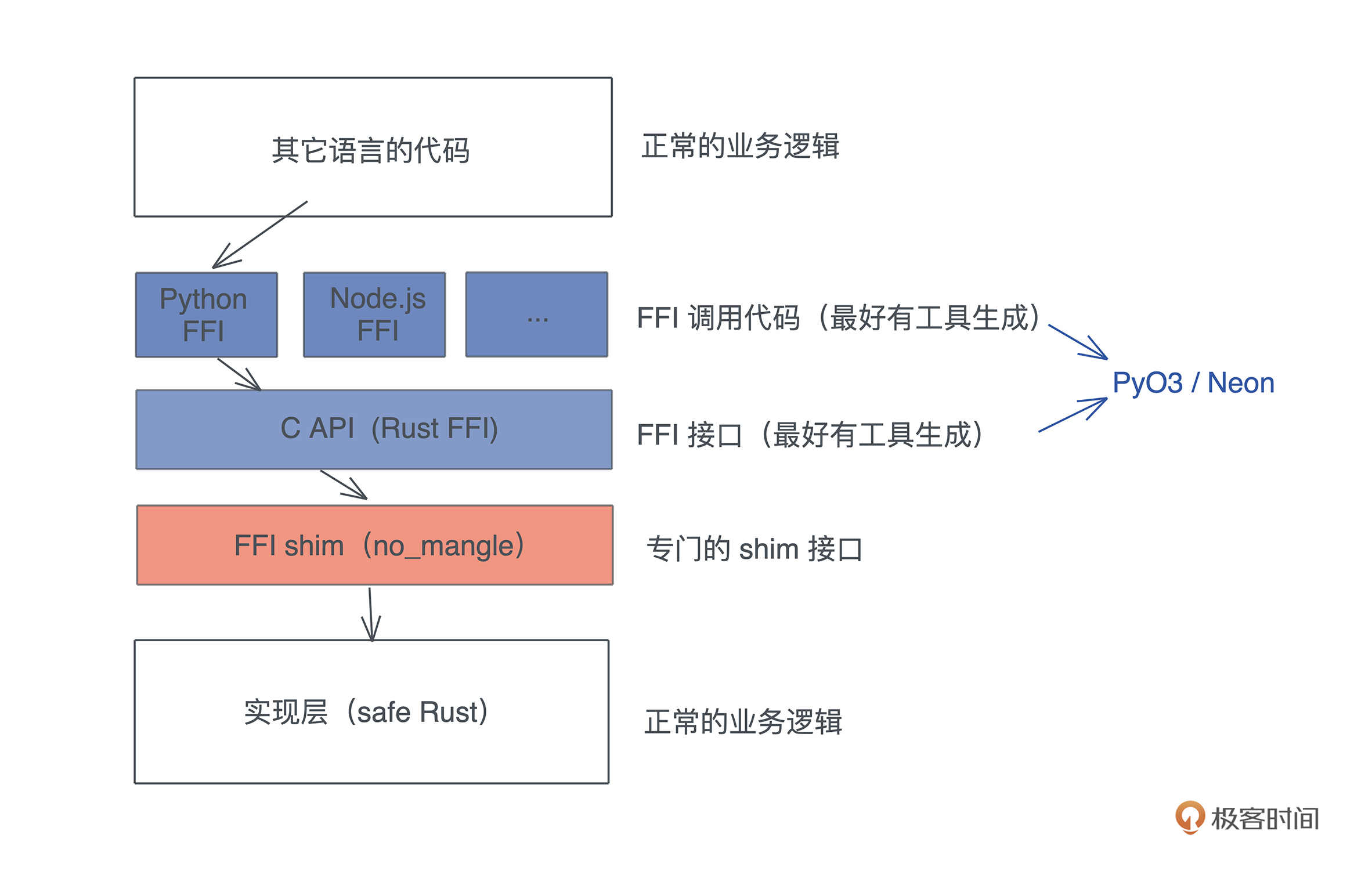 由于社区里已经有 PyO3 和 Neon 这样的工具,我们并不需要处理 Rust 代码兼容 C ABI 的细节,这些工具就可以直接处理。所以,今天会主要撰写 FFI shim 这一层的代码:-