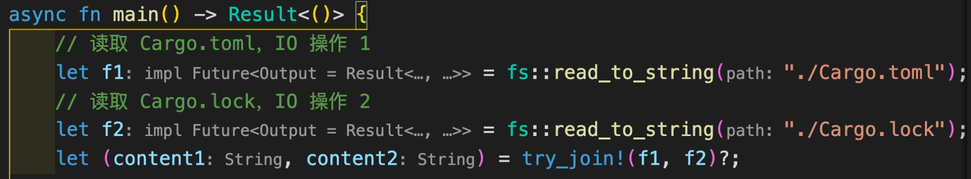 这样写的话,和第一版同步的版本没有区别,因为 await 会运行 Future 直到 Future 执行结束,所以依旧是先读取 Cargo.toml,再读取 Cargo.lock,并没有达到并发的效果。