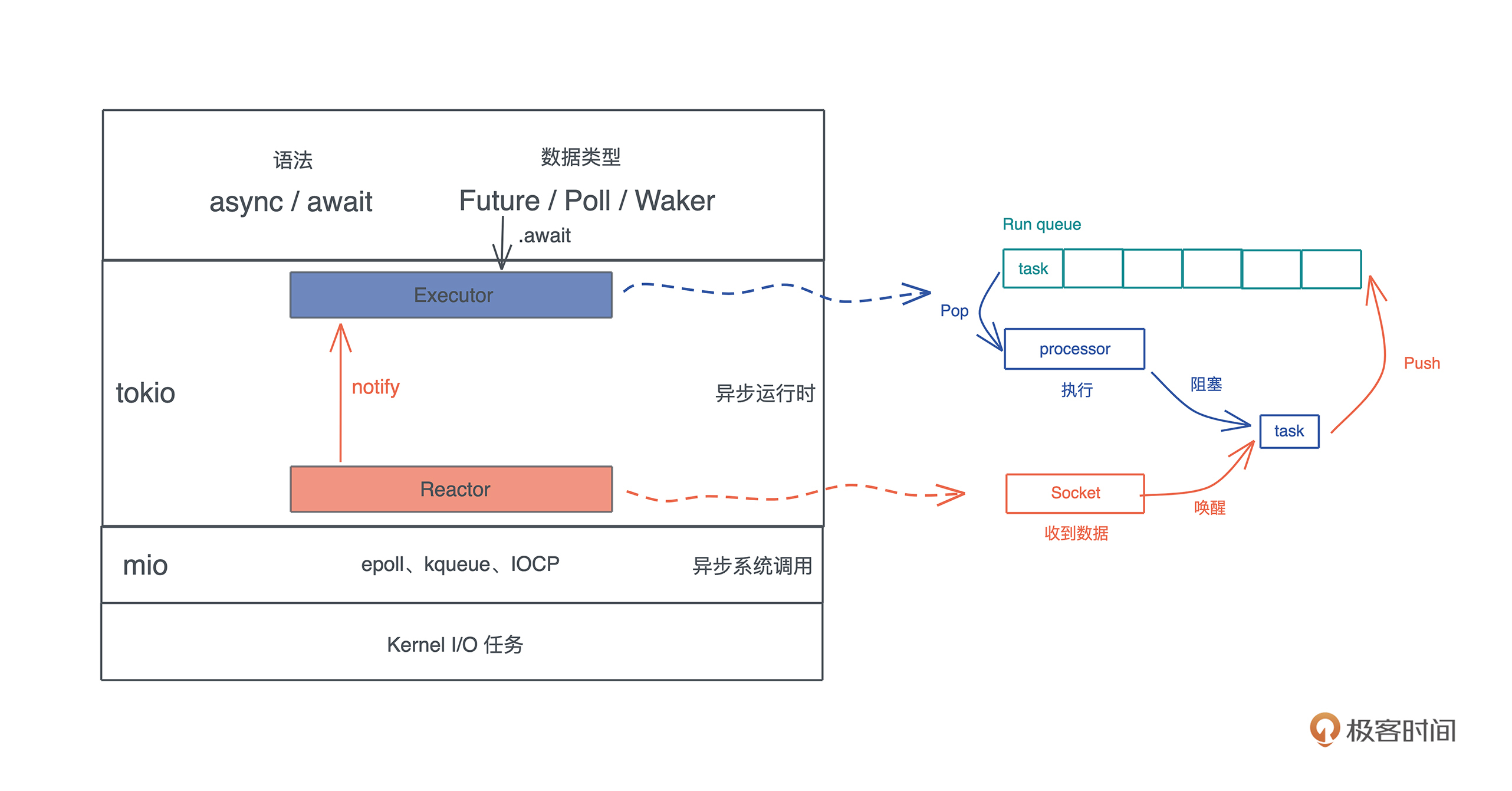 通过拆解async fn 有点奇怪的返回值结构,我们学习了 Reactor pattern,大致了解了 tokio 如何通过 executor 和 reactor 共同作用,完成 Future 的调度、执行、阻塞,以及唤醒。这是一个完整的循环,直到 Future 返回 Poll::Ready(T)。