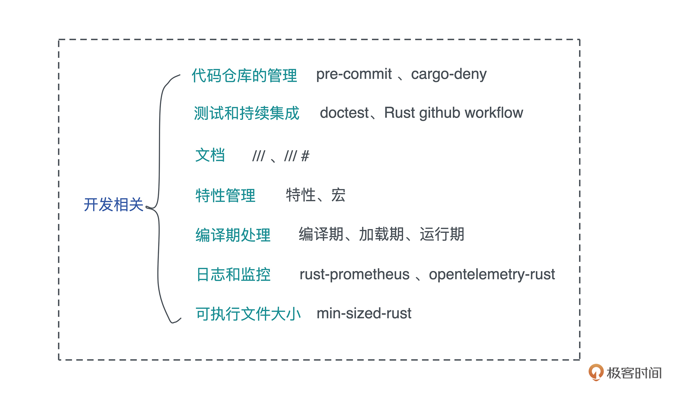 在上面完整开发流程图中,今天只涉及了主要的部分。你可以结合自己现有工作的流程,思考一下如果把 Rust 引入到你的工作中,哪些流程能够很好地适配,哪些流程还需要额外的工作?
