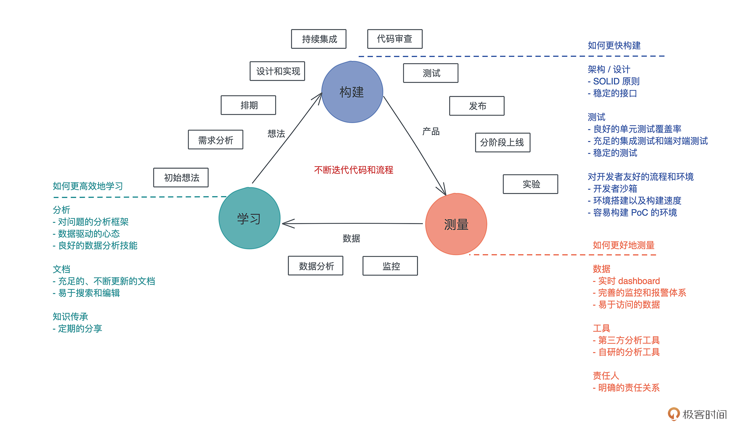 看这张图,一个项目的整体开发流程相信是你所熟悉,包括初始想法、需求分析、排期、设计和实现、持续集成、代码审查、测试、发布、分阶段上线、实验、监控、数据分析等部分,我把它贯穿到精益创业(Lean Startup)“构建 - 测量 - 学习”(Build - Measure - Learn)的三个环节中。