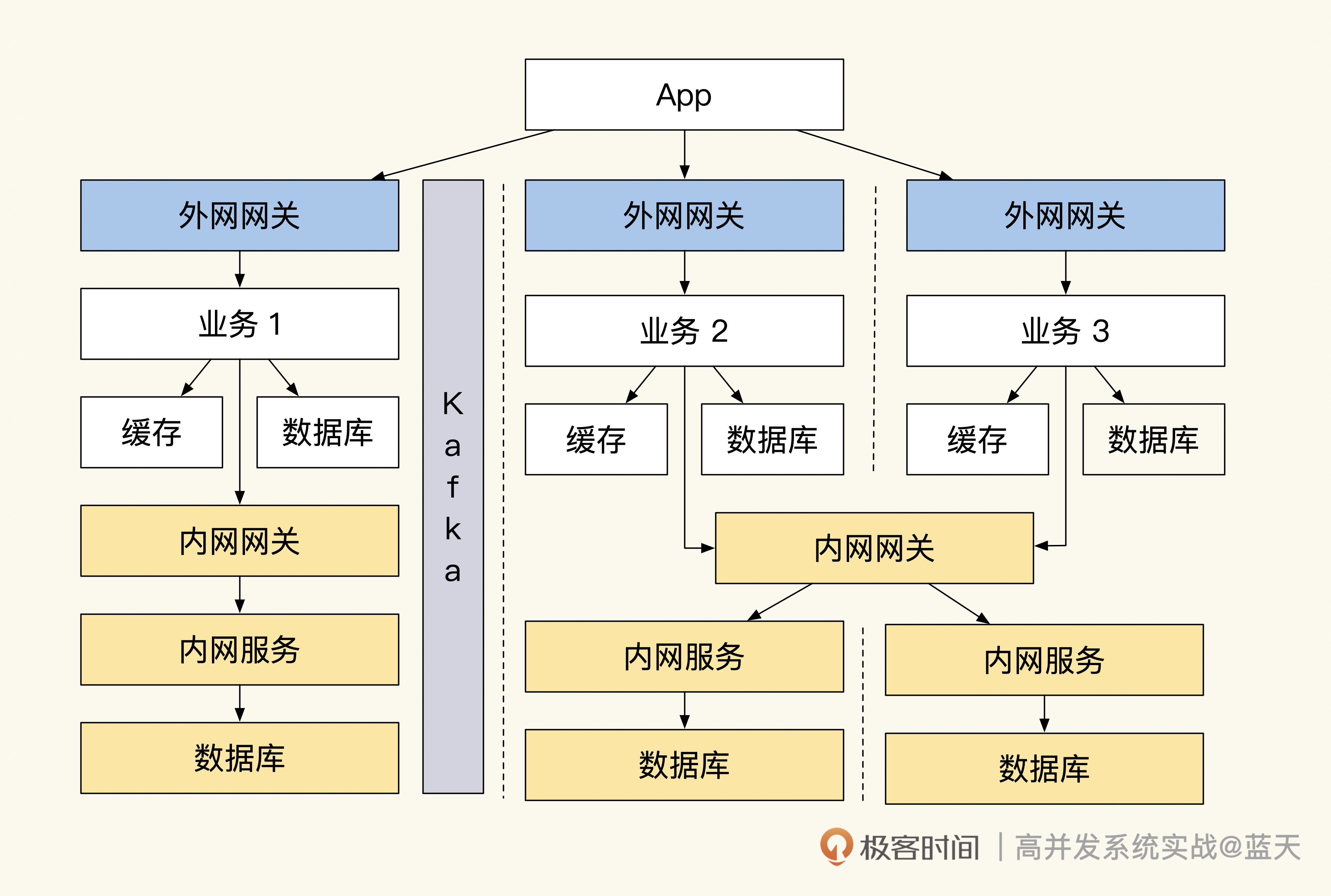 在这个改造方案中有两种网关:外网网关和内网网关。每个业务都拥有独立的外网网关(可根据需要调整)来对外网流量做限流。当瞬时流量超过系统承受能力时,网关会让超编的请求排队阻塞一会儿,等服务器QPS高峰过后才会放行,这个方式比起直接拒绝客户端请求来说,可以给用户更好的体验。