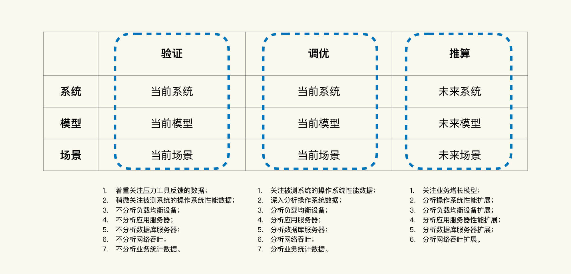 上述就是我们按照目标划分出的三类性能场景,这里我用一张图帮你总结一下,我希望你能对它们有了一个清楚的了解。