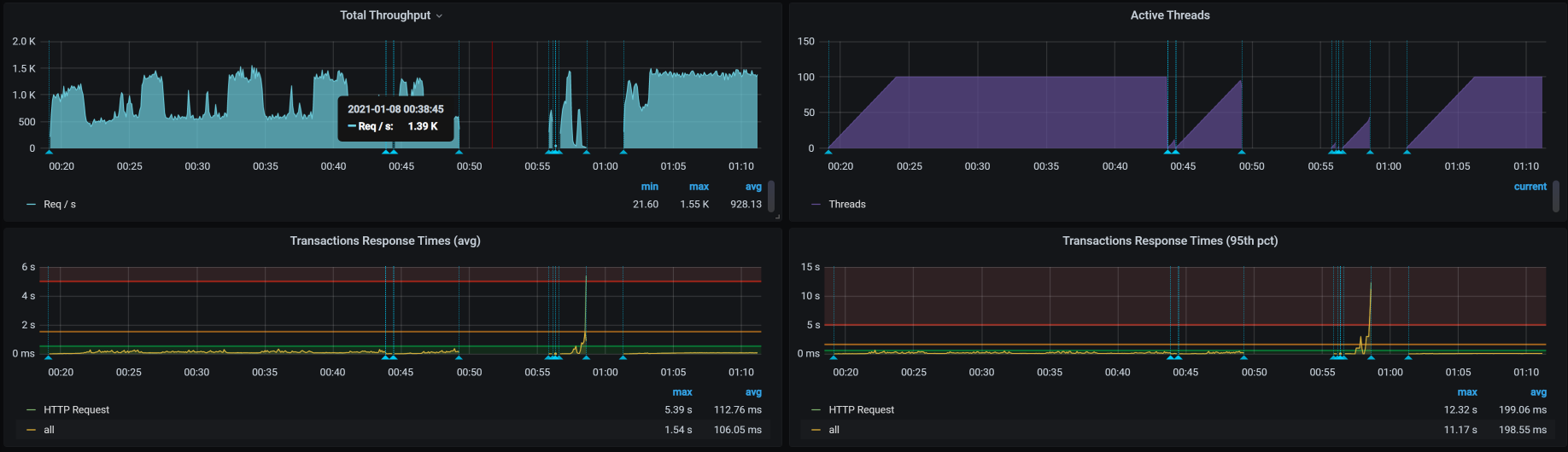 那我们就修改Tomcat参数,把线程数、连接数调大,再来一次。你可能奇怪,为什么要这样调呢?这是因为在查看应用线程健康状态的过程中,我注意到Spring Boot里的Tomcat线程很忙。