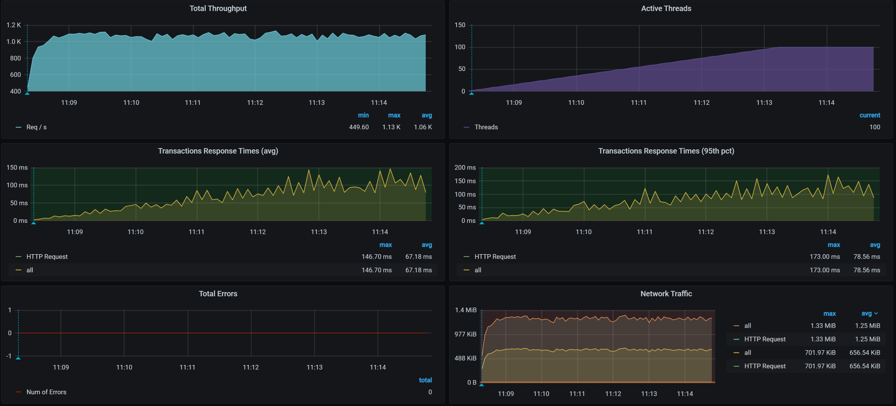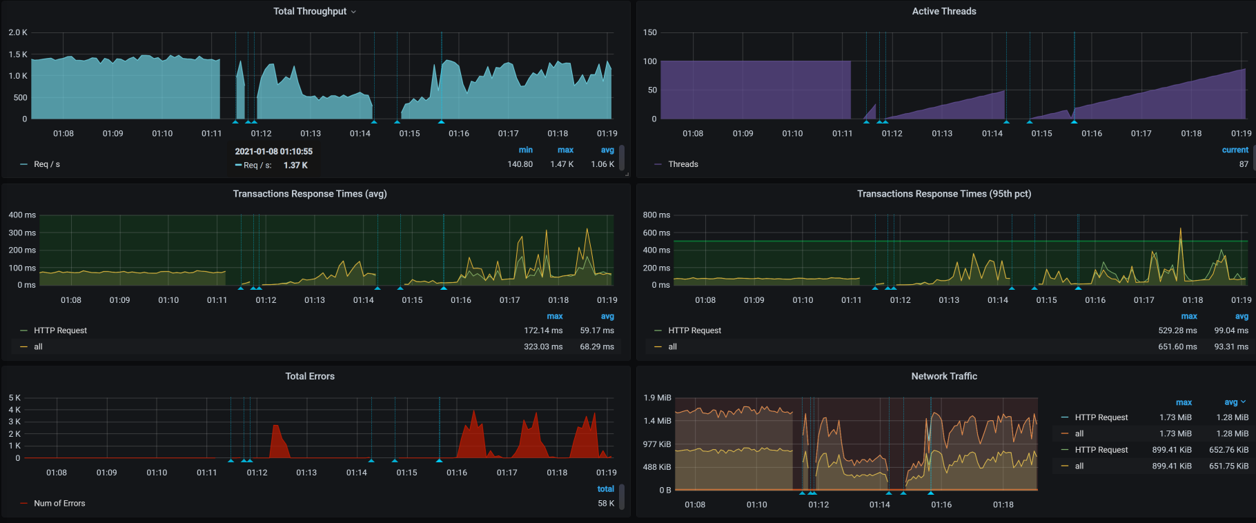从下面这张图我们也可以看到,当压力经过这个Ingress时,报错是必然的,压力越大,报错越多。