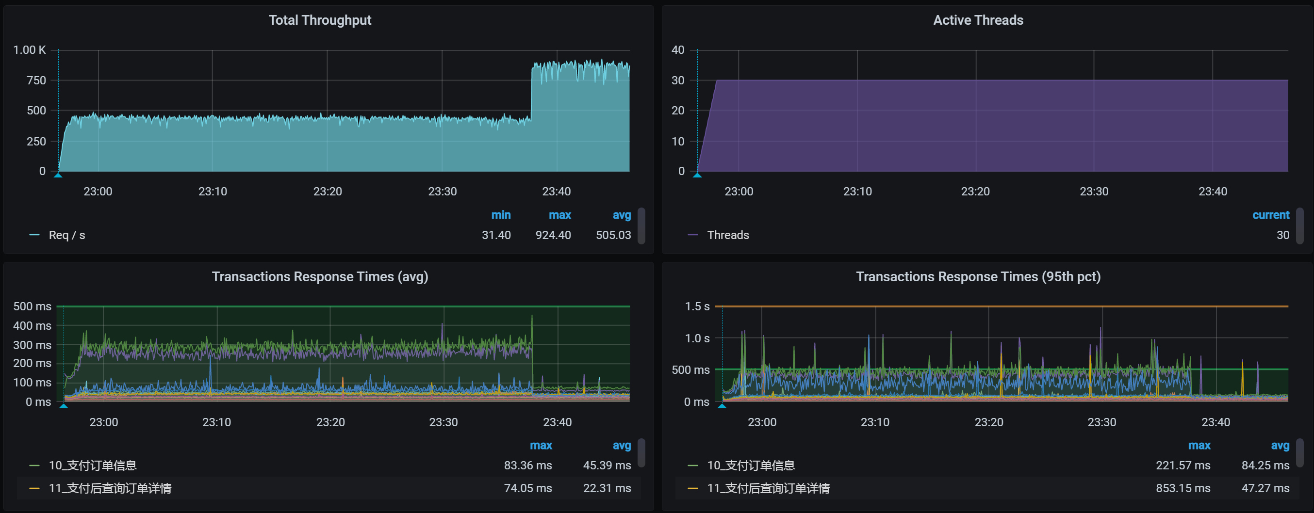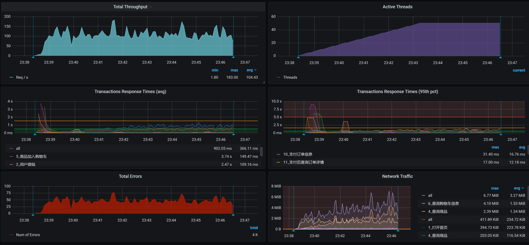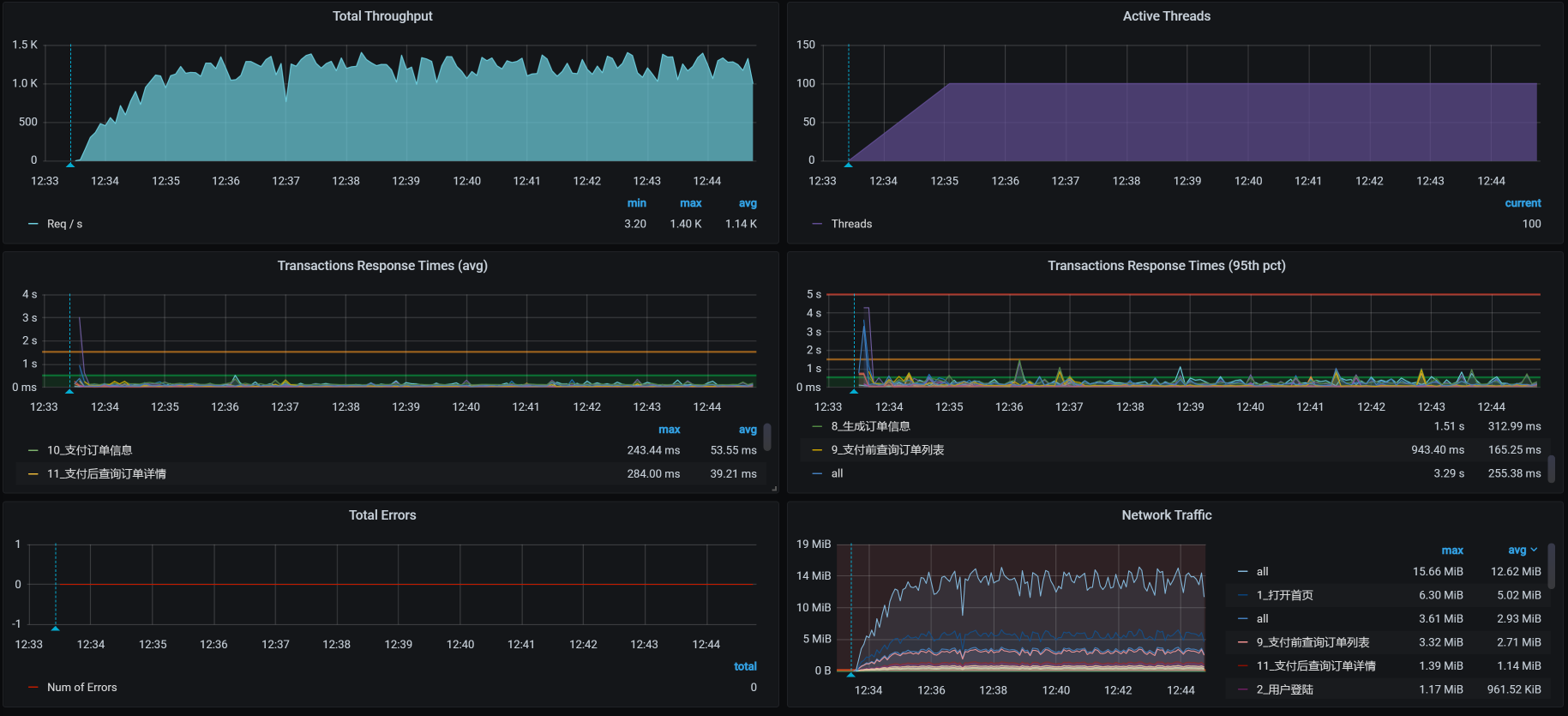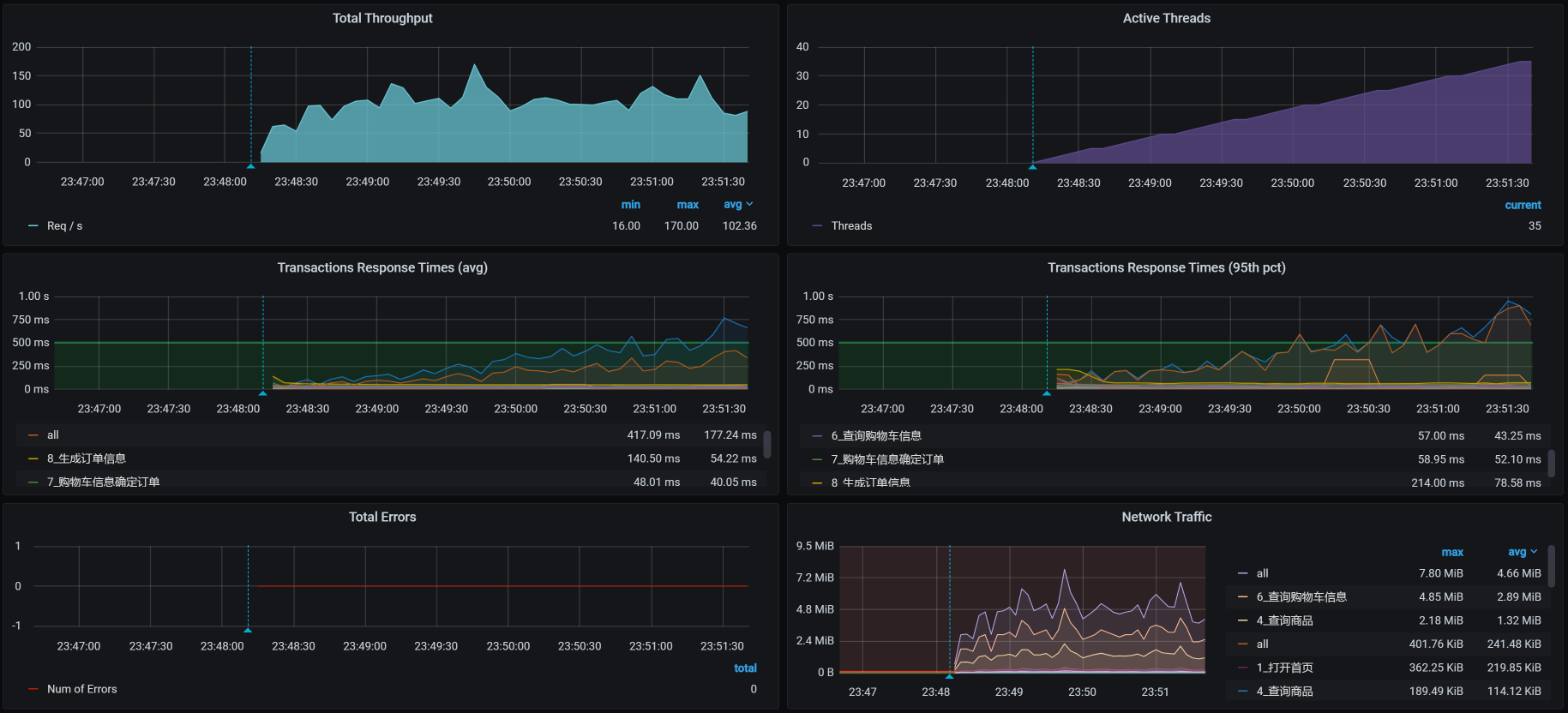接着我们把容量场景再执行起来,我们得到下面这张全局监控图: