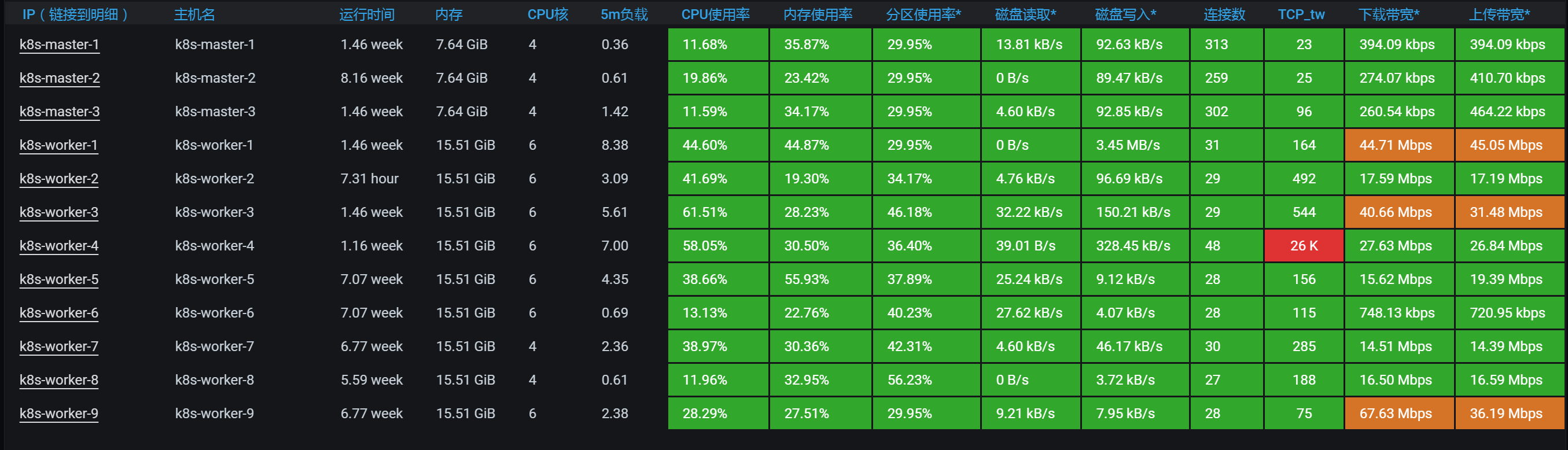看到全局监控数据的第一个界面,我们就已经可以发现资源消耗比较高的节点了。从数据来看,worker-3的CPU使用率上来了达到了90%以上,worker-4的CPU使用率也上来了达到了70%以上,也就是说TPS会不断地掉下来。下面我带着你来分析一下。