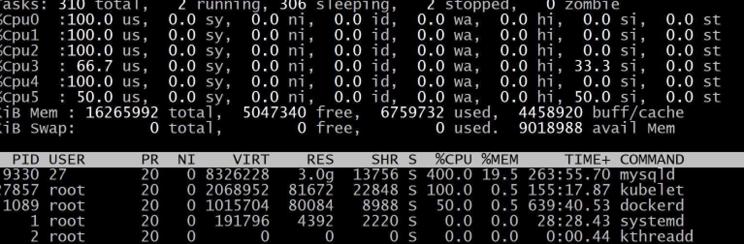 1087 root 20 0 2574160 132160 31928 S 25.6 0.8 1637:21 /usr/bin/kubelet --bootstrap-kubeconfig=/etc/kubernetes/bootstrap-kubelet.conf --kubeconfig=/etc/kubern+
