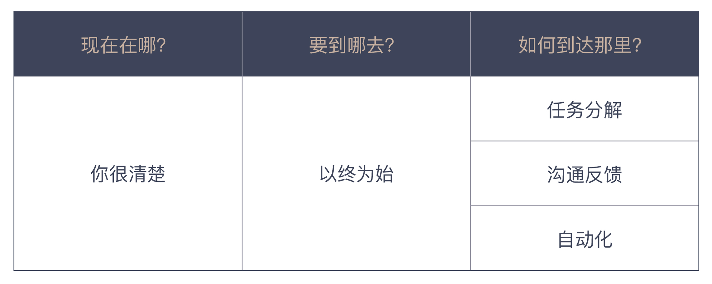 其实,这三个问题来自一个思考框架。在给其他公司团队做咨询时,我也经常会运用到它,原来的问题是: