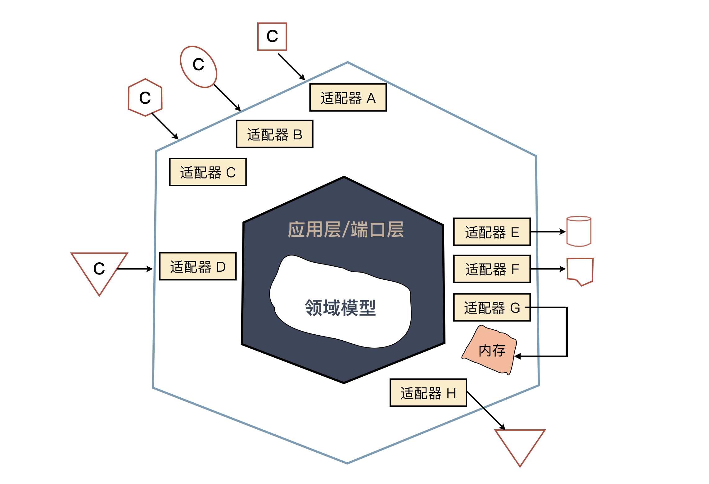当我们把领域模型看成了整个设计的核心,看待其他层的视角也会随之转变,它们只不过是适配到不同地方的一种方式而已,而这种理念的推广,就是一些人在说的六边形架构。