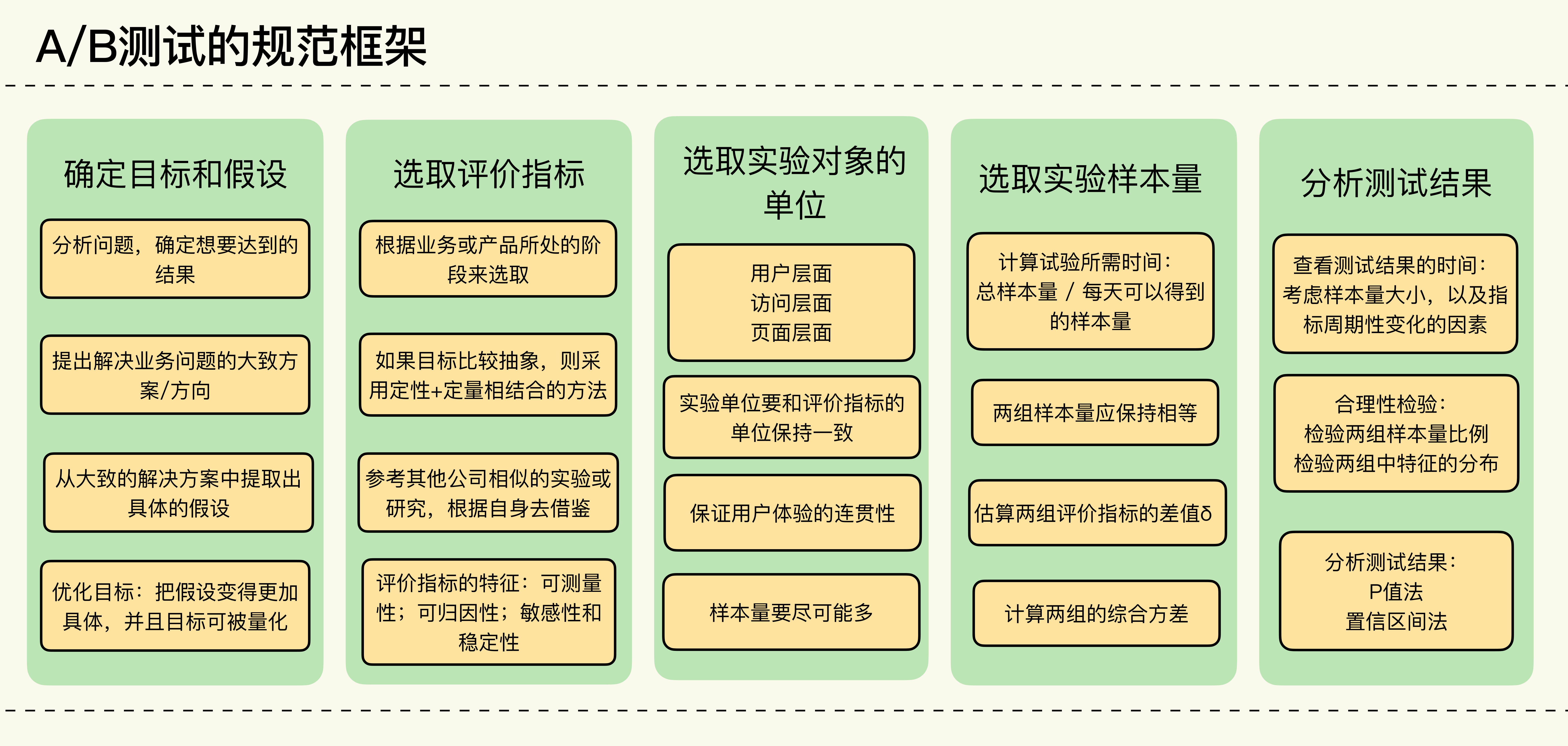经过前面几节课的学习,相信你不仅掌握了做A/B测试的统计原理,还知道了一个规范的A/B测试的流程是什么样的,以及关键步骤中有哪些需要注意的地方。