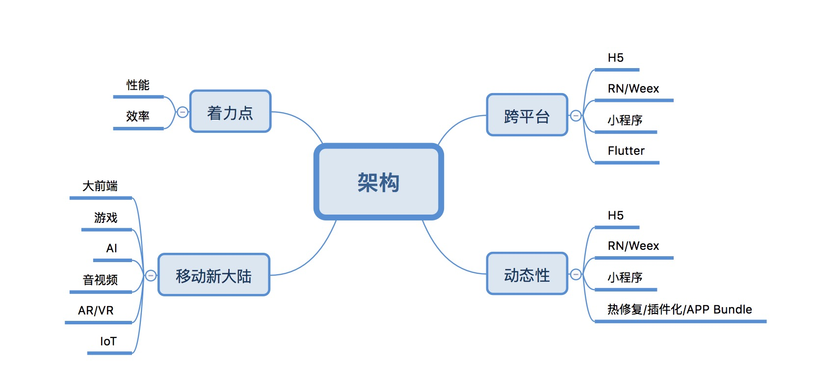 最后一个模块是“架构演进”,我希望告诉你架构是为性能和效率服务的。无论是H5、React Native/Weex、小程序、Flutter,还是类似游戏、音视频、AI这些移动开发“新大陆”,它们都是殊途同归。