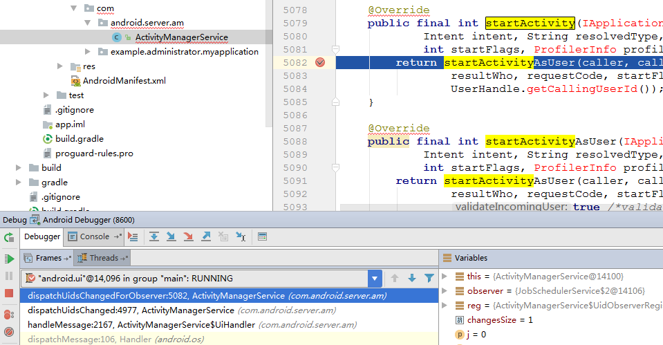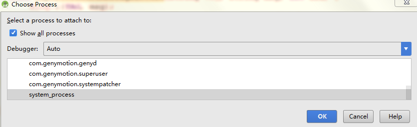 在ActivityManagerService.java的startActivity方法上面设置断点,然后找到菜单的Run -> Attach debugger to Android process勾选Show all process,选中SystemServer进程确定。