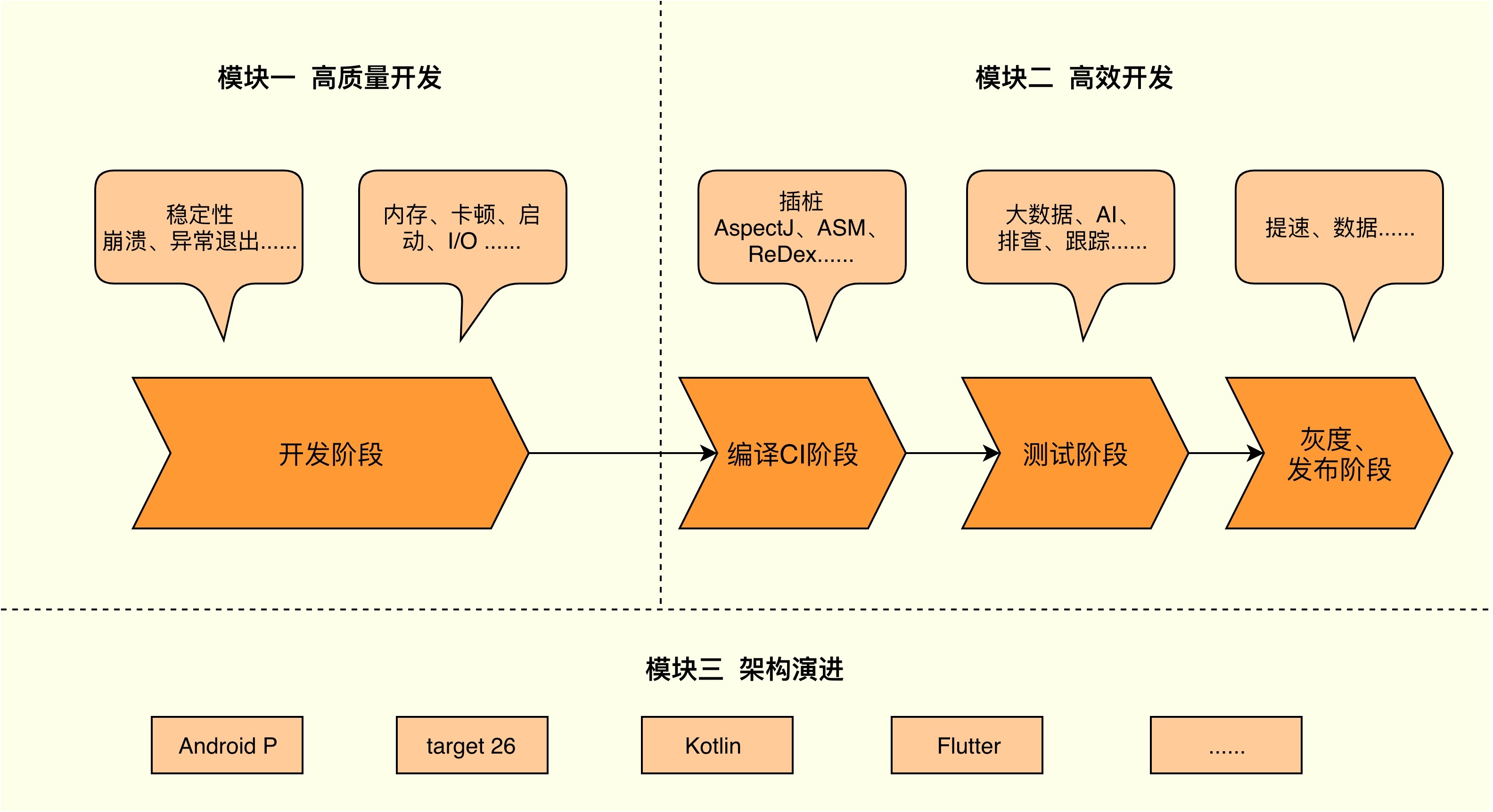 1.开发阶段。在面试的时候,常常有人说自己熟练掌握各种开发工具。但是,我们真的懂吗?就拿我们比较熟悉的耗时分析工具Traceview来说,它背后的实现原理是什么?能不能做一个完全没有性能损耗的Traceview?或者怎么样将它移植到线上使用?