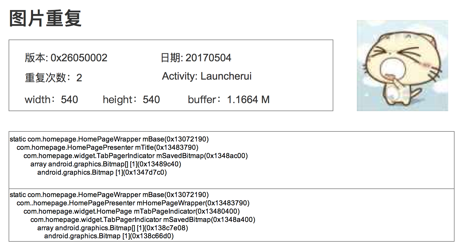 • 重复图片监控。重复图片指的是Bitmap的像素数据完全一致,但是有多个不同的对象存在。这个监控不需要太多的样本量,一般只在内部使用。之前我实现过一个内存Hprof的分析工具,它可以自动将重复Bitmap的图片和引用链输出。下图是一个简单的例子,你可以看到两张图片的内容完全一样,通过解决这张重复图片可以节省1MB内存。