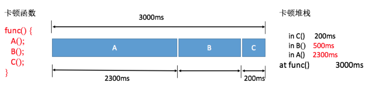 不过对于线上大数据来说,因为函数A和B相对比较耗时,所以抓取到它们的概率会更大一些,通过后台聚合后捕获到函数A和B的卡顿日志会更多一些。