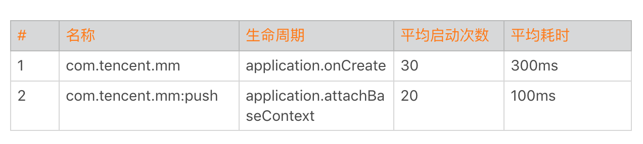 除了四大组件的生命周期,我们还需要监控各个进程生命周期的启动次数和耗时。通过下面的数据,我们可以看出某些进程是否频繁地拉起。