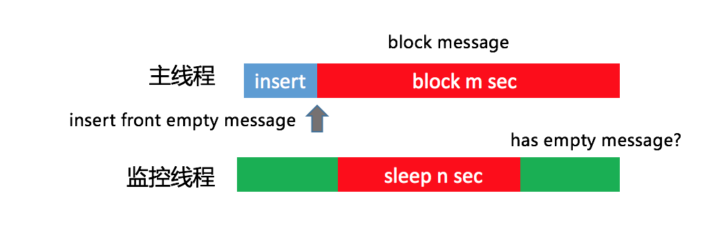 后来很快又想到了另外一个方案,可以通过一个监控线程,每隔1秒向主线程消息队列的头部插入一条空消息。假设1秒后这个消息并没有被主线程消费掉,说明阻塞消息运行的时间在0~1秒之间。换句话说,如果我们需要监控3秒卡顿,那在第4次轮询中头部消息依然没有被消费的话,就可以确定主线程出现了一次3秒以上的卡顿。