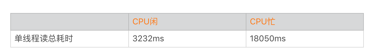 通过上面的数据你可以看到,我们发现使用NIO整体性能跟非NIO差别并不大。这其实也是可以理解的,在CPU闲的时候,无论我们的线程是否继续做其他的工作,当前瓶颈依然在磁盘,整体耗时不会太大。在CPU忙的时候,无论是否使用NIO,单线程可以抢到的CPU时间片依然有限。