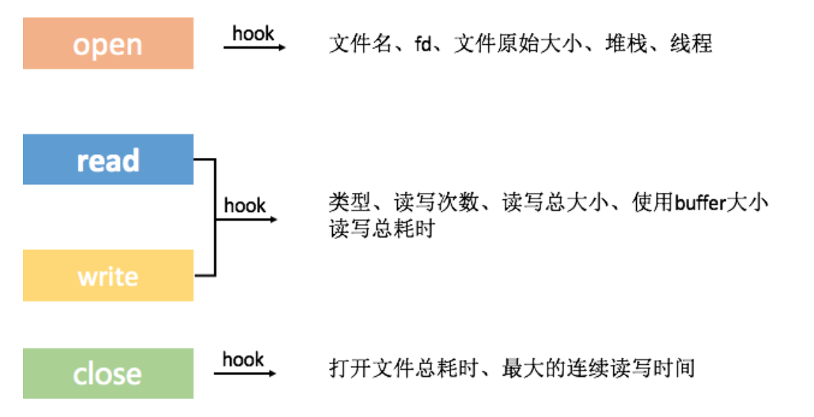 接着我们还希望得到这一次操作一共使用了多长时间,使用的Buffer是多大的。是一次连续读完的,还是随机的读取。通过上面Hook的四个接口,我们可以很容易的采集到这些信息。