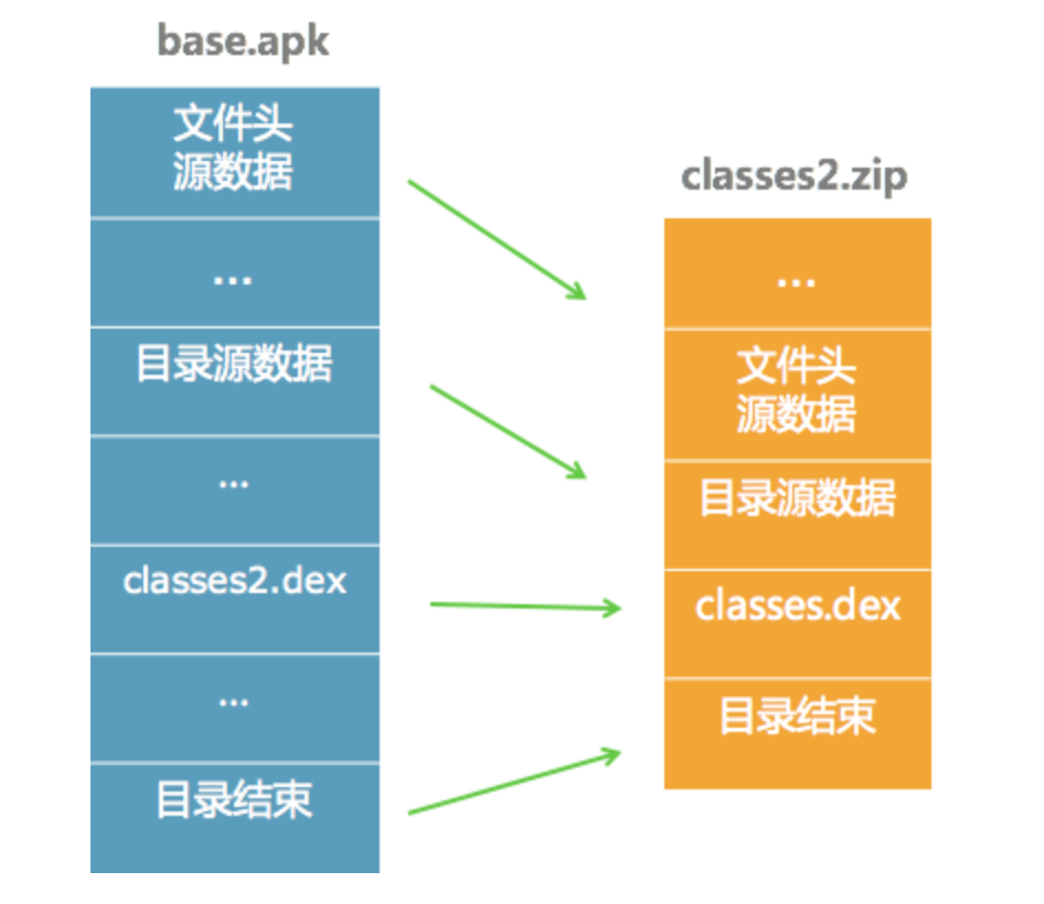 那个时候通过研究ZIP格式的源码,我发现只要能构造出一个符合ZIP格式的文件,那就可以直接将classses2.dex的压缩流搬到classes2.zip中。整个过程没有任何一次解压和压缩,这个技术也同样应用到Tinker的资源合成中。