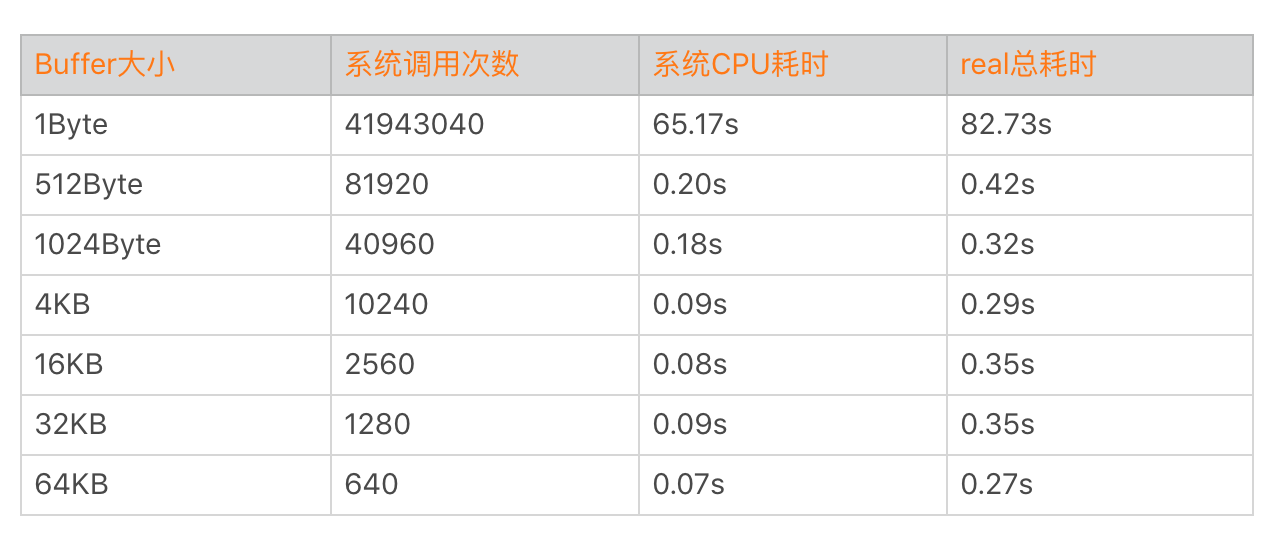 通过上面的数据大致可以看出来,Buffer的大小对文件读写的耗时有非常大的影响。耗时的减少主要得益于系统调用与内存拷贝的优化,Buffer的大小一般我推荐使用4KB以上。