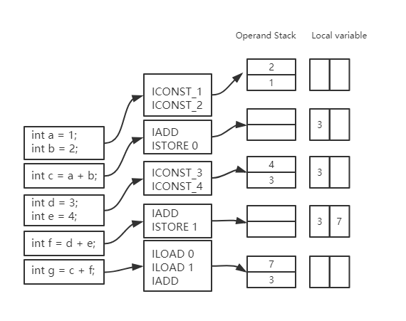 ICONST_1将int类型1推送栈顶,ICONST_2将int类型2推送栈顶,IADD指令将栈顶两个int类型的值相加后将结果推送至栈顶。操作数栈的最大深度也是由编译期决定的,很多时候ASM修改后的代码会增加操作数栈最大深度。不过ASM已经提供了动态计算的方法,但同时也会带来一些性能上的损耗。