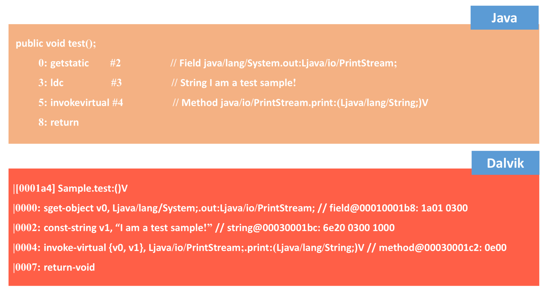 它们的格式和指令都有很明显的差异。关于Java字节码的介绍,你可以参考JVM文档。对于Dalvik字节码来说,你可以参考Android的官方文档。它们的主要区别有: