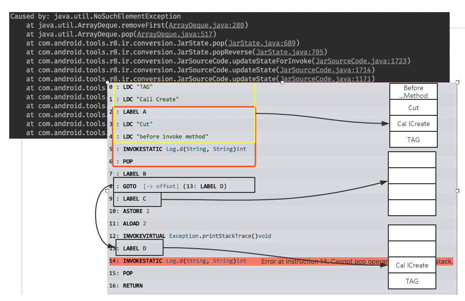 在具体的字节码处理过程中,特别需要注意的是本地变量表和操作数栈的数据交换和try catch blcok的处理。