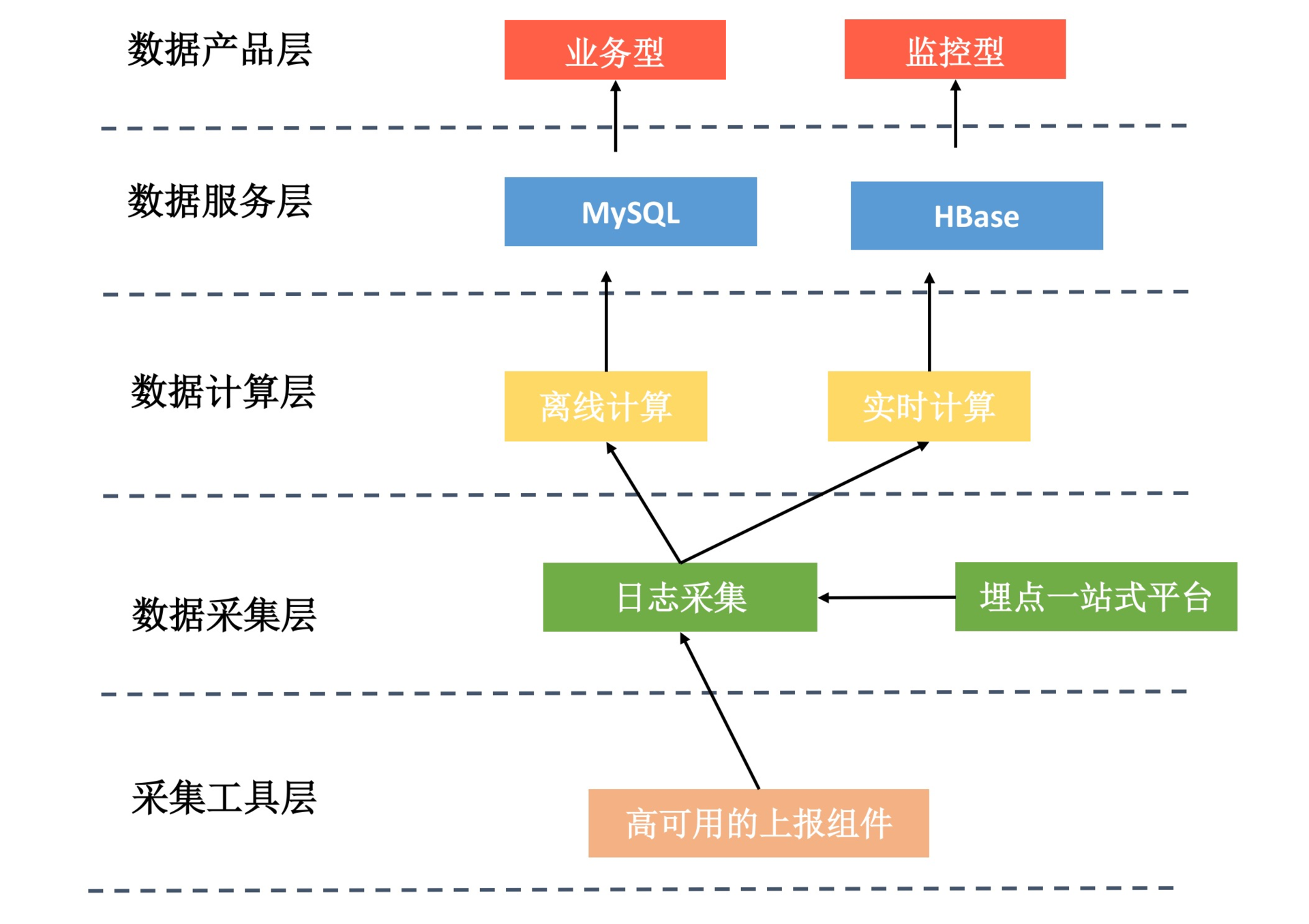 采集工具层。应用的上报组件负责数据埋点、日志的组装上报,它需要保证数据的准确性和实时性。