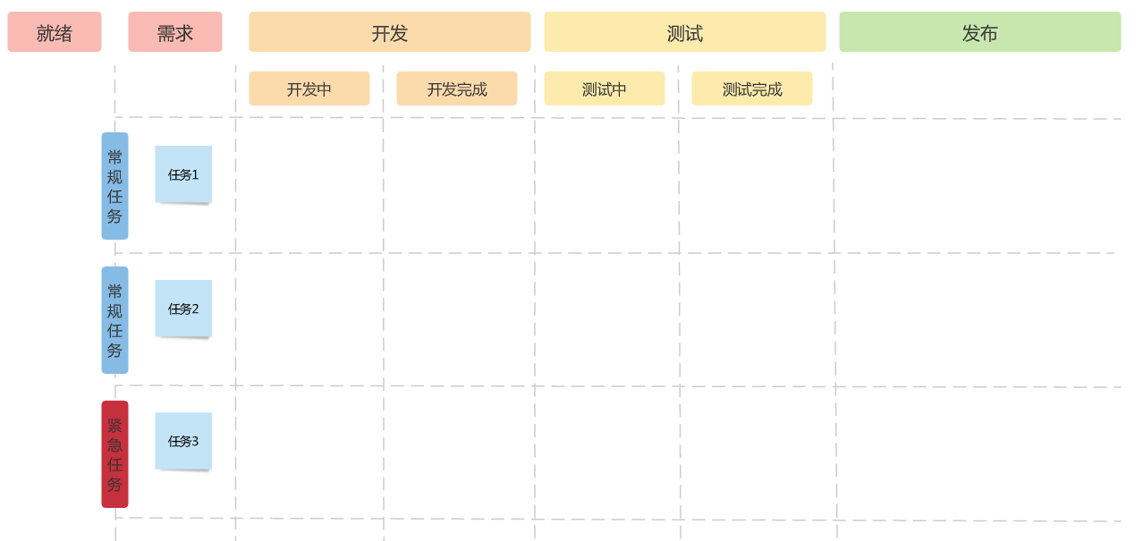 当然,泳道的意义不只如此。泳道还可以按照不同维度划分。比如,有的看板设计中会加入紧急通道,用于满足紧急需求的插入。另外,非业务类的技术改进需求,也可以在独立泳道中进行。对于前后端分离的项目来说,一个需求会拆分成前端任务和后端任务,只有当前后端任务都完成之后才能进行验收。这时,就可以把前后端任务放在同一个泳道中,从而体现需求和任务的关联关系,以及任务与任务之间的依赖关系,快速识别当前阻塞交付的瓶颈点。