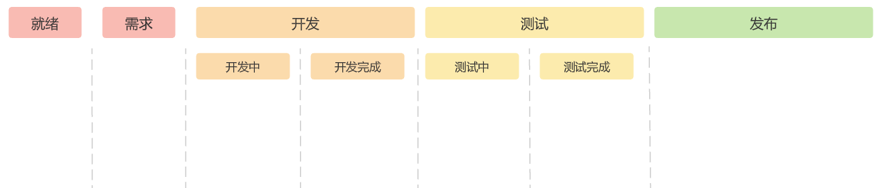 这是指看板的竖向队列,是按照价值流转的各个主要阶段进行划分的,比如常见的需求、开发、测试、发布等。对识别出来的每一列进一步可以划分成“进行中”和“已完成”两种状态,这也是精益看板拉动式生产的一个显著特征。对于列的划分粒度可以很细,比如开发阶段可以进一步细分成设计、编码、自测、评审、提测等环节,或者就作为一个单独的开发环节存在。划分的标准主要有两点: